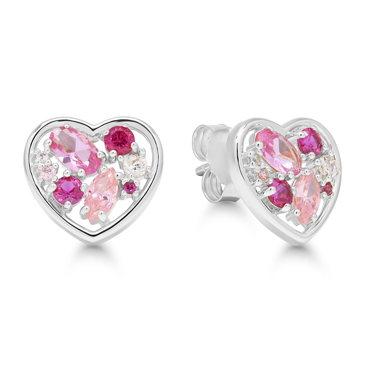 Südamekujulised hõbedased kõrvarõngad kollektsioonist Beat of Love, milles on punased rubiinid ja eri värvi roosad sünteetilised safiirid ning valged tsirkoonid.
