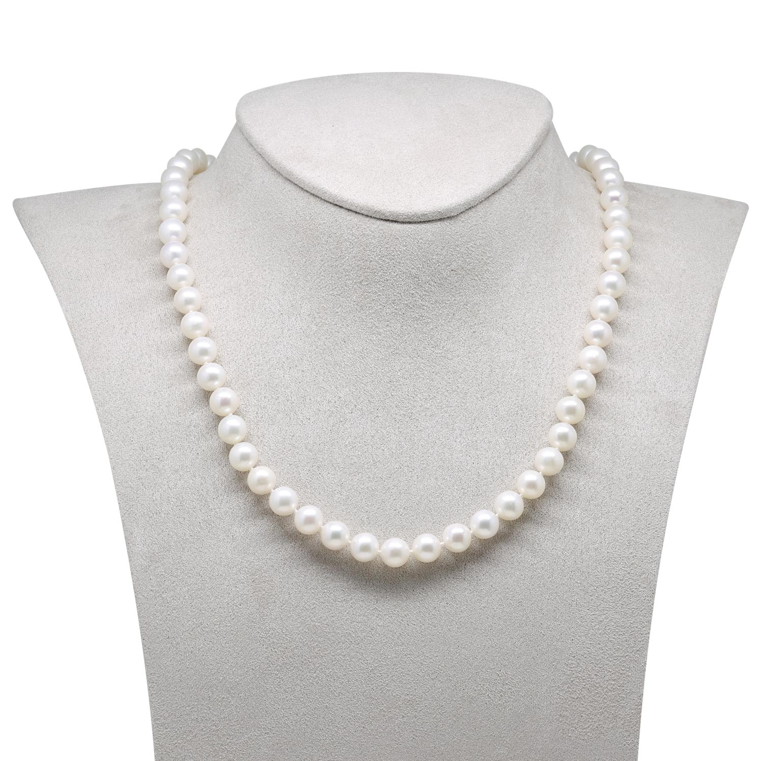 Kaunis hõbedase ümmarguse hõbedase klambriga kaelakee. Kvaliteetsed, peaaegu täiuslikult ümmargused, valged AAAA pärlid, mis on uimastava läikega.