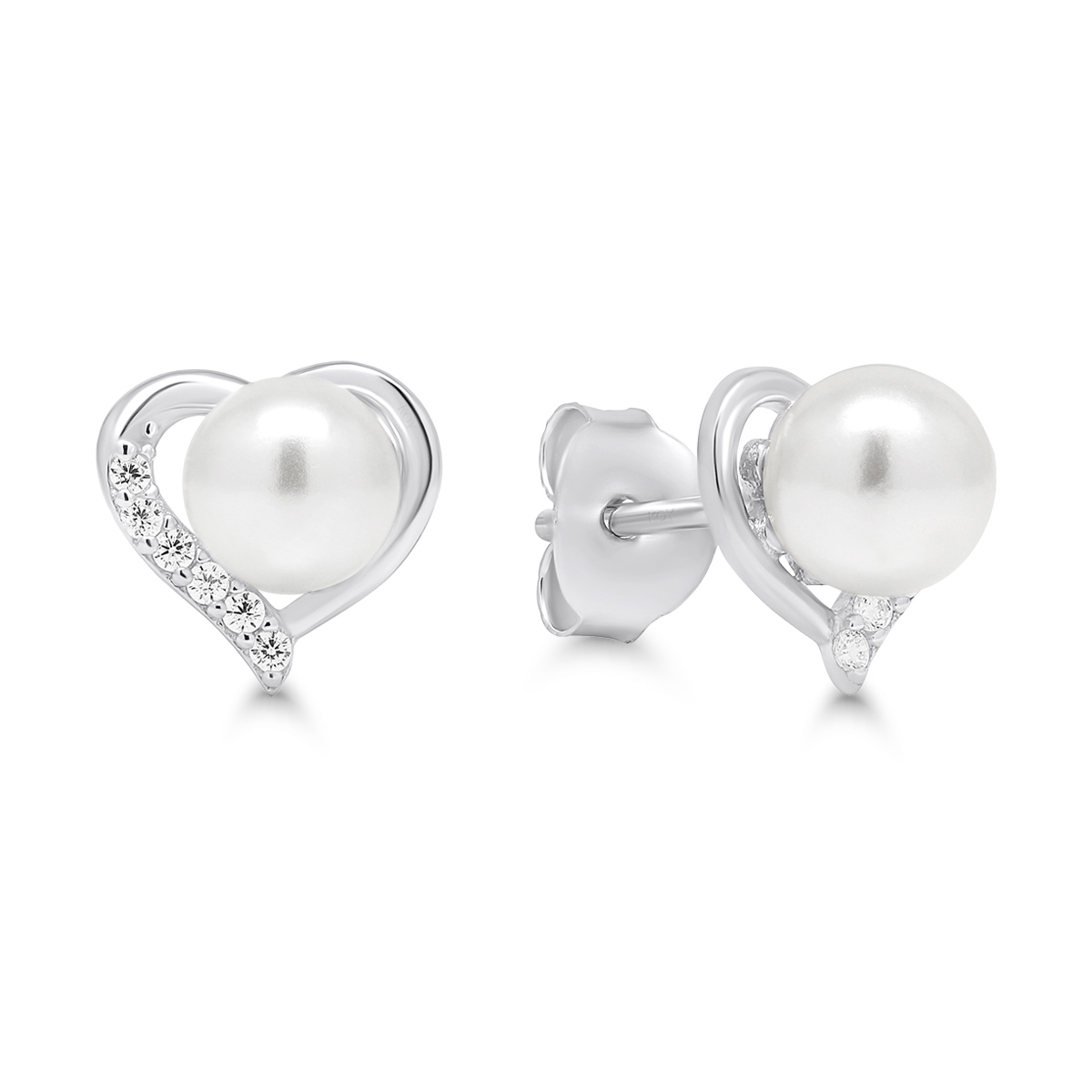 Hõbedast südamega kõrvarõngad sünteetiliste tsirkoonide ja helmedega.