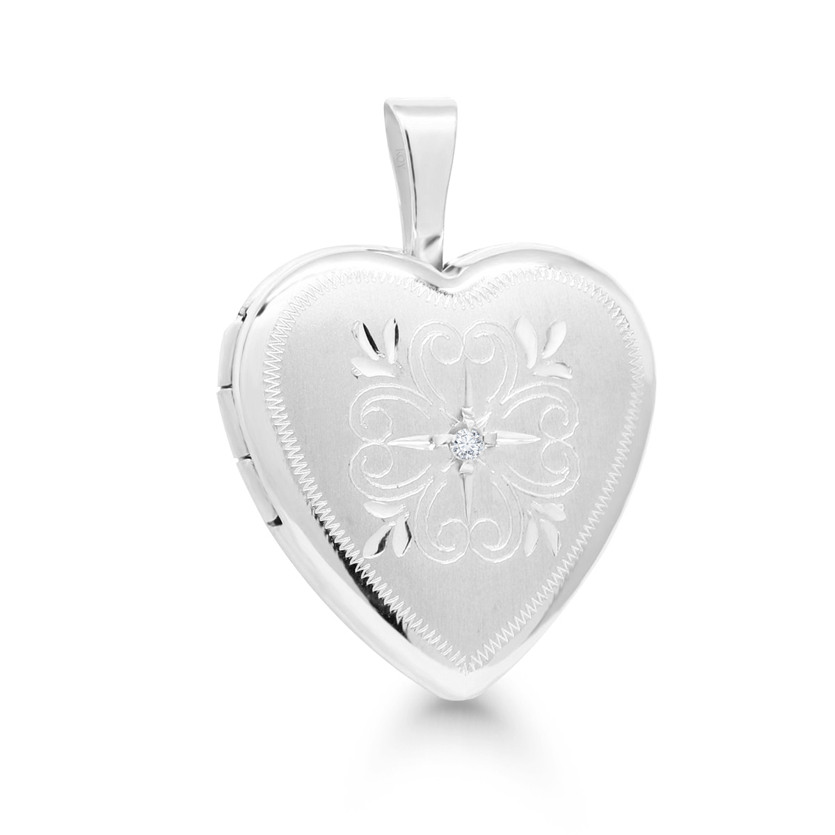 Südamekujuline hõbedast medaljon kaunite dekoratiivsete graveeringute ja sünteetiliste tsirkooniumidega, ruumi kahele pildile.