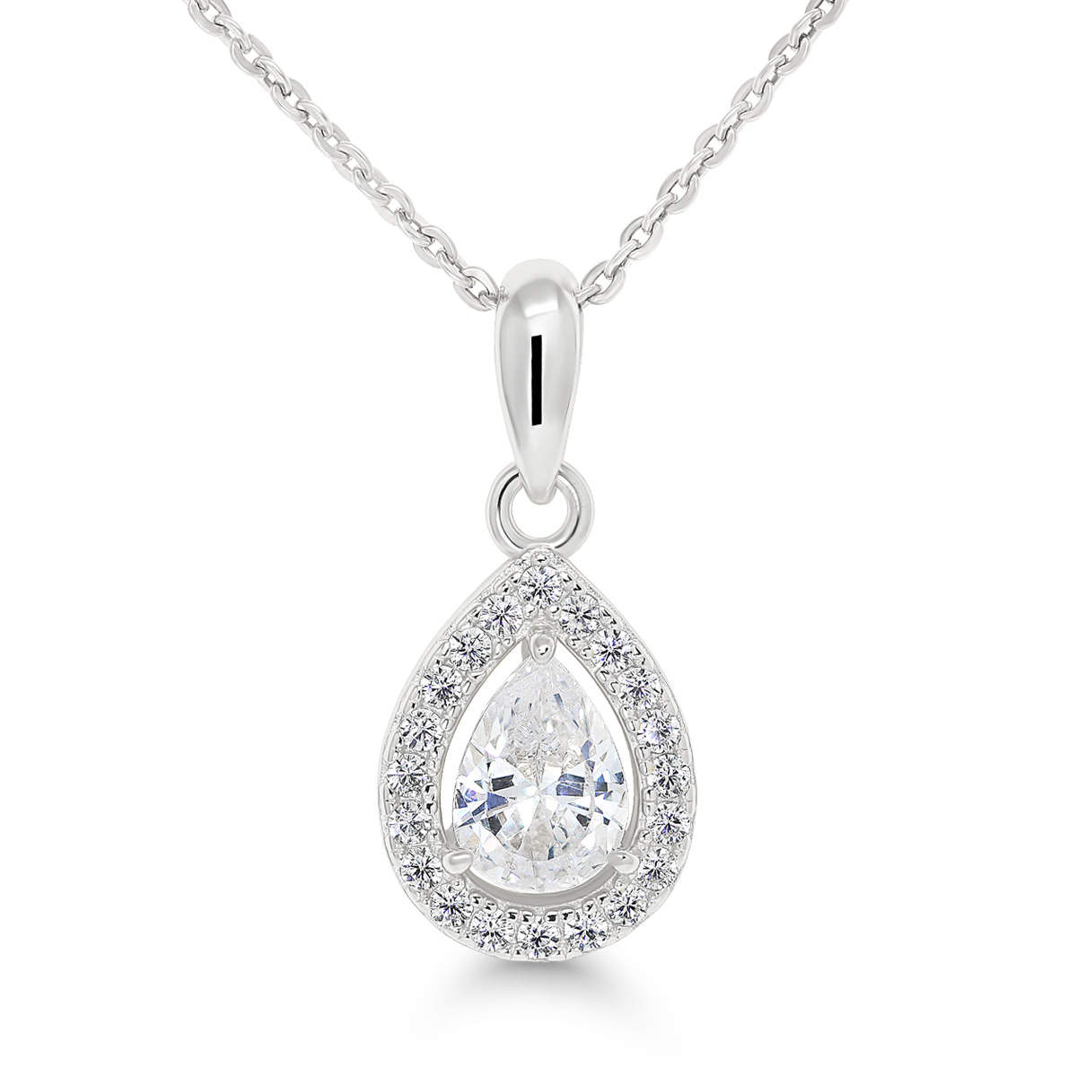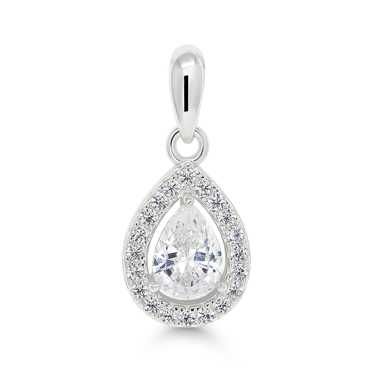 Hõbedast pisarakujuline halo ripats läbipaistvate tsirkoonkividega.