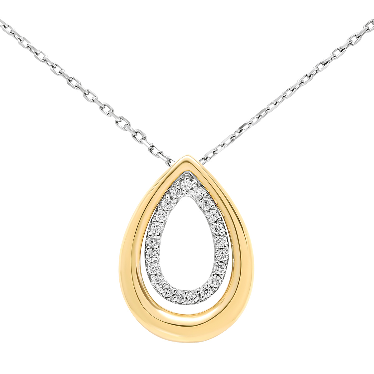 Elegantne kahetooniline kuldne avatud tilgakujuline teemantidega kaelakee. Kaunis kollasest kullast tilgake on väiksem valge kulla tilgakujuline 21 väikese teemandiga. Teemantide kogumass 0,13ct Wesselton/SI1. 44 cm pikkune valge kuldkett on kaasas.