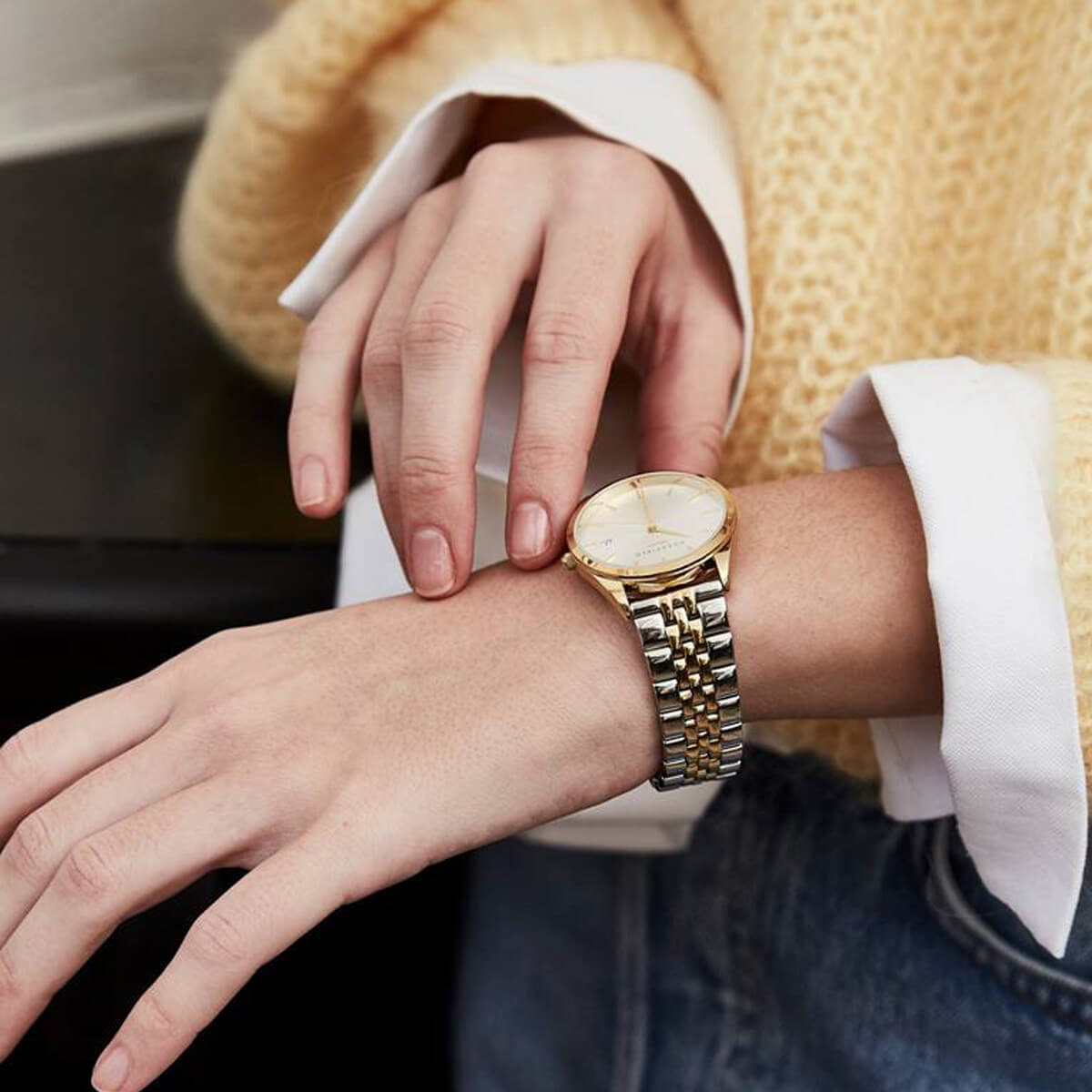 Rosefield The Ace – kollase kulla värvi korpus ja kahetooniline kuld/hõbedast terasest käevõru, hõbedane numbrilugu