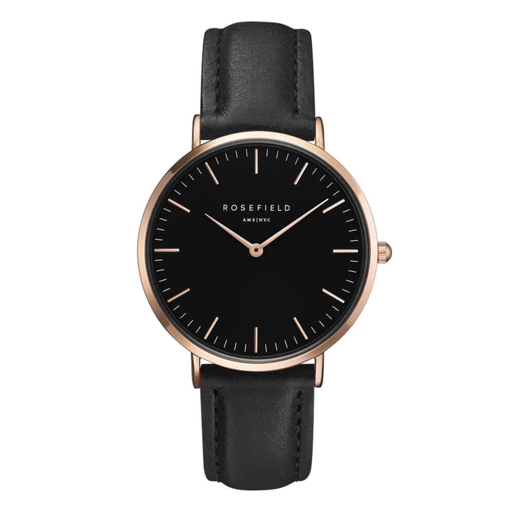 Rosefield Bowery käekell musta numbrimärgi, musta nahkrihma ja punase kullatud korpusega.