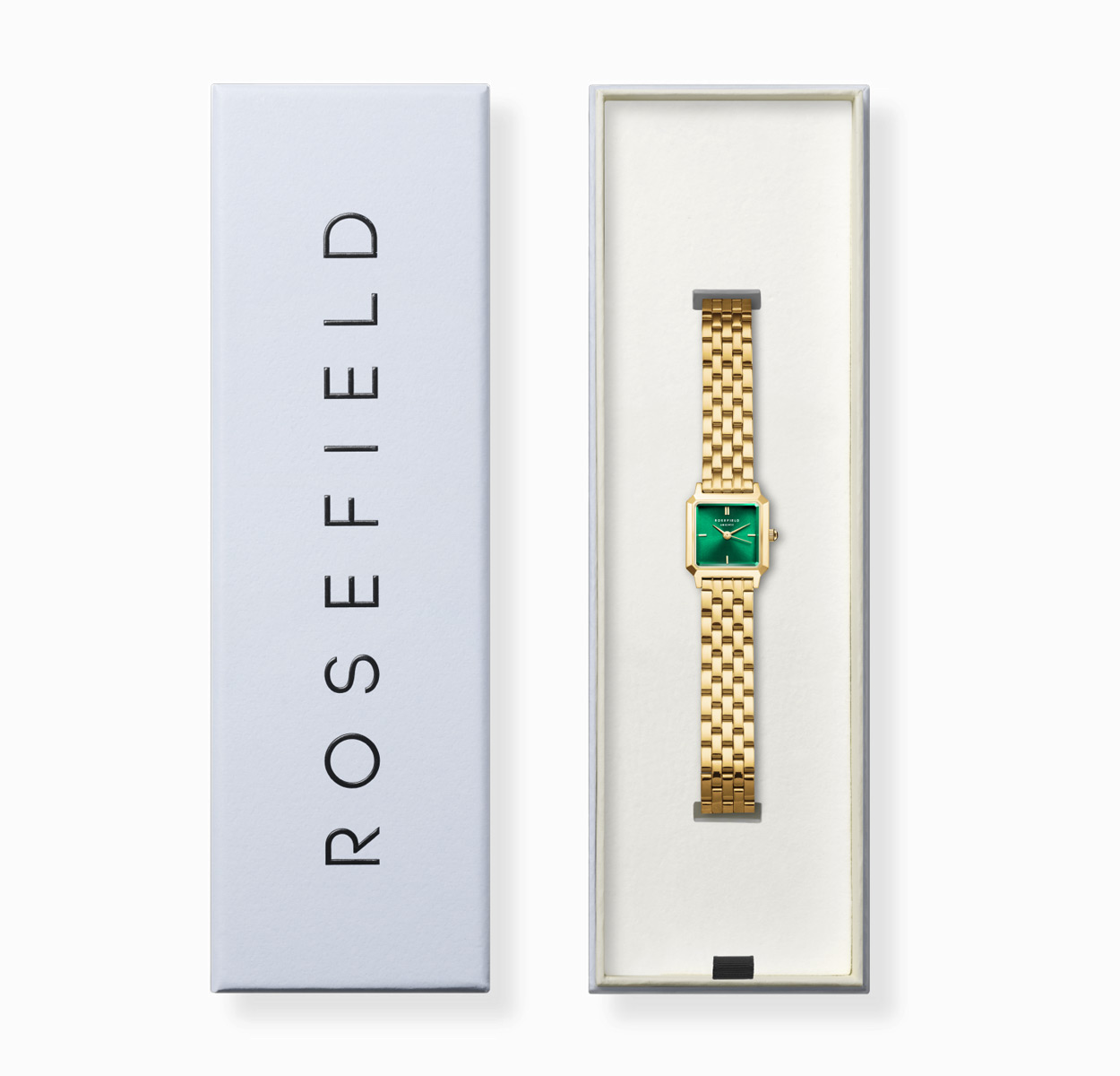 Rosefield Boxelle graatsiline ja särtsakas naiste käekell, kollane kuldne käevõru ja smaragdroheline numbrileht
