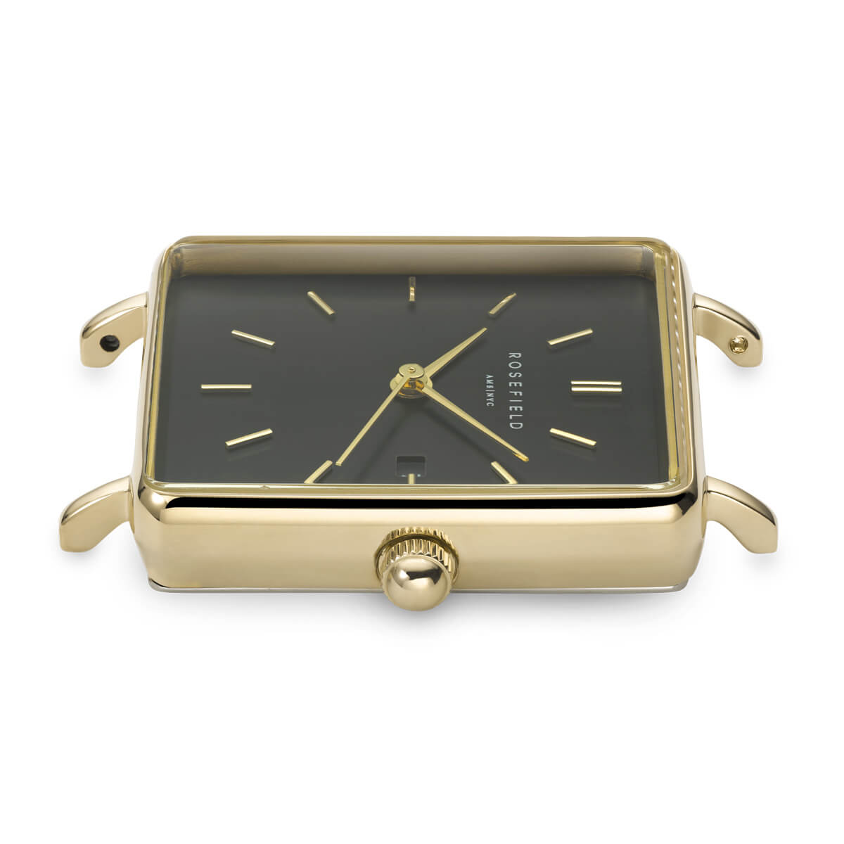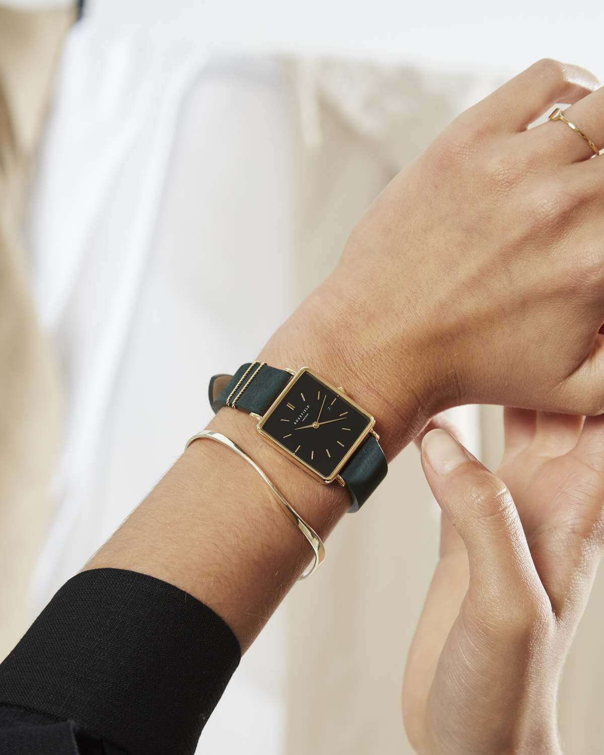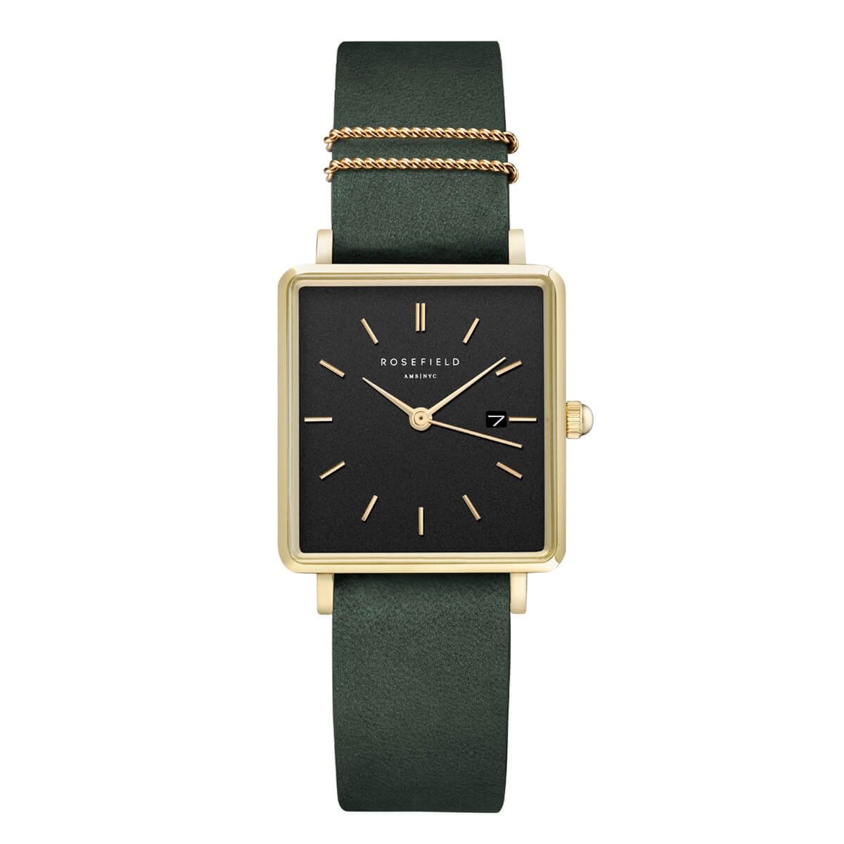 Rosefield The Boxy – kollakuldne kullatud korpus, tumeroheline mokkarihm, must numbrileht kollakuldsete detailidega.