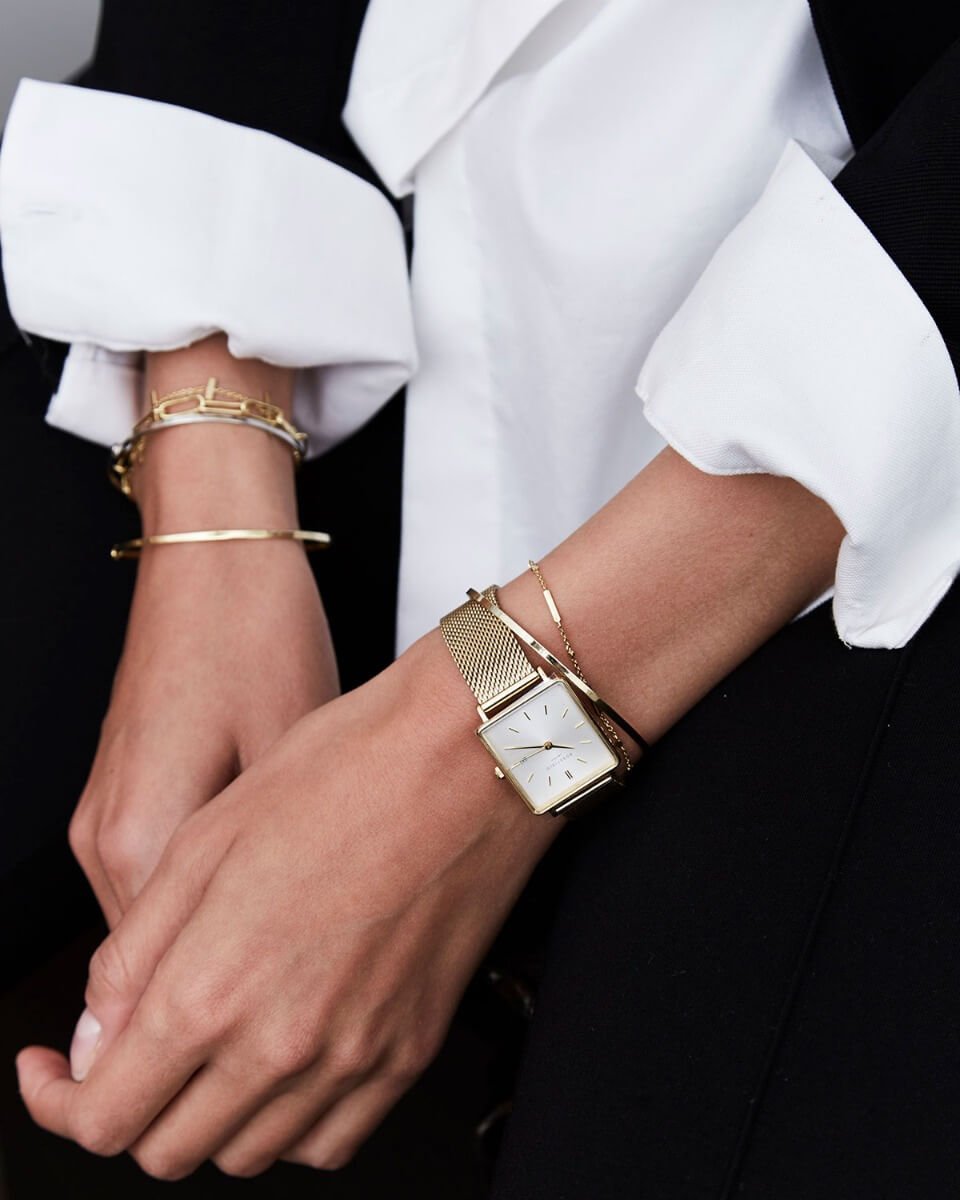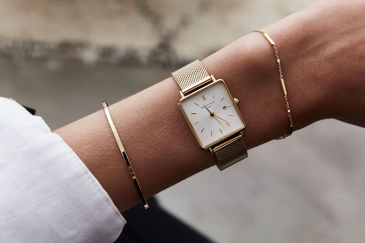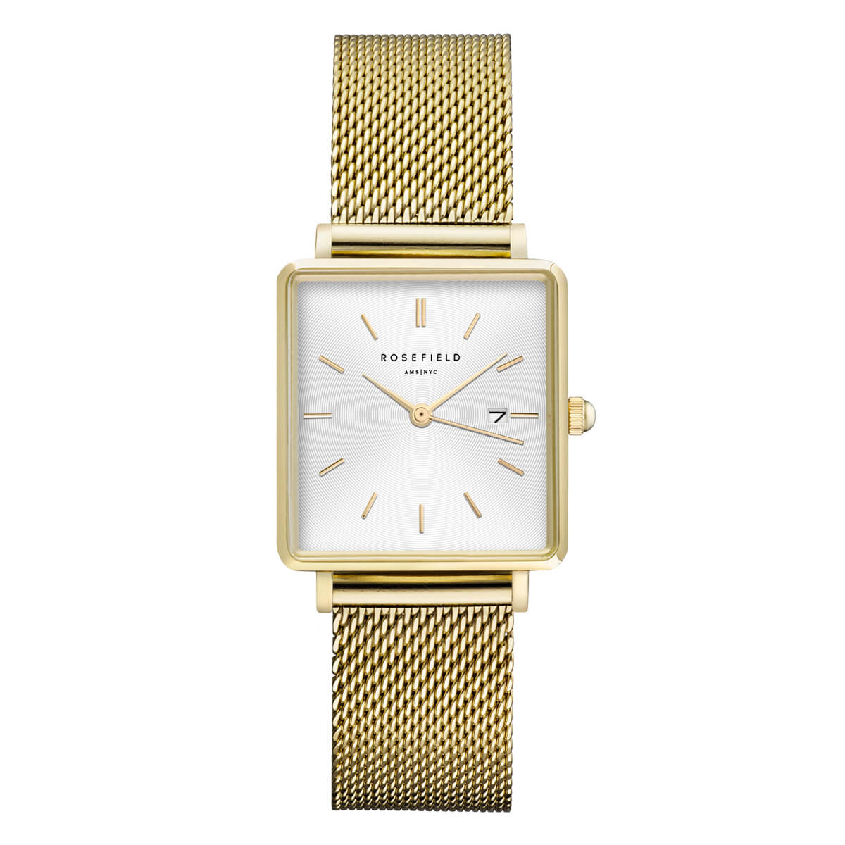 Rosefield The Boxy – kollase kulla värvi kest, tekstuurne heledate päikesekiirtega tagakülg ja kollase kulla värvi terasvõrk rihm.