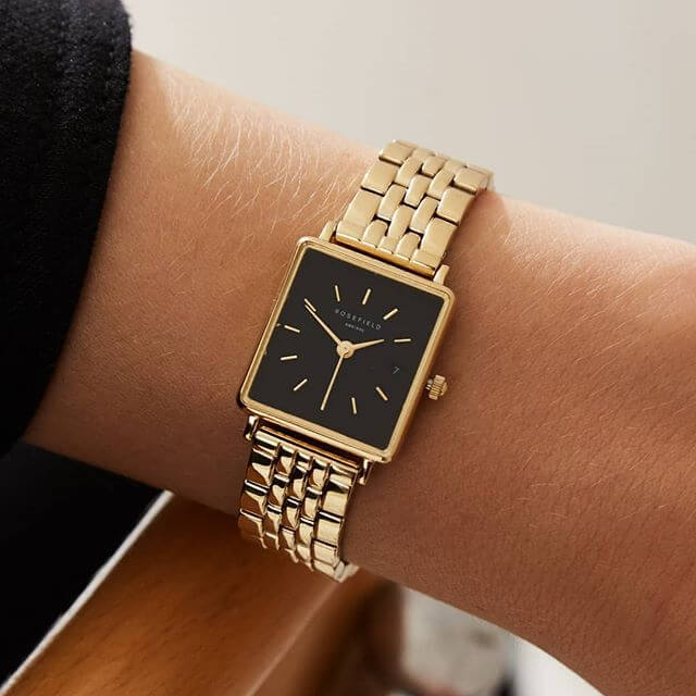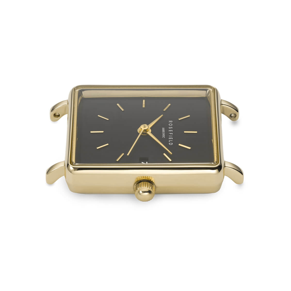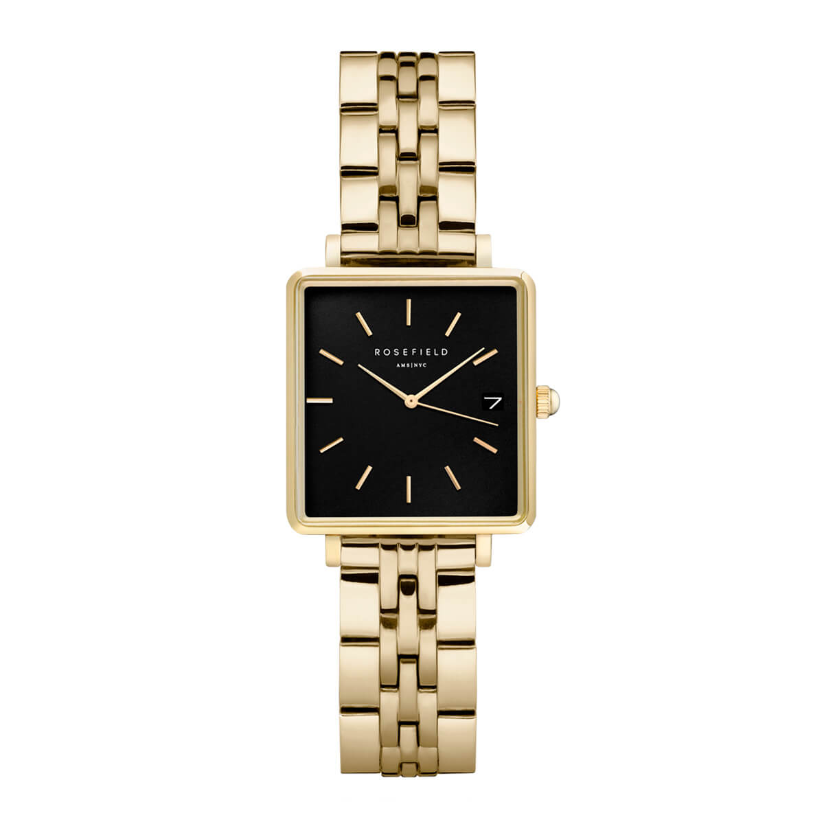 Rosefield The Boxy XS on elegantse, kullavärvi naiste käekell, millel on must numbrileht.