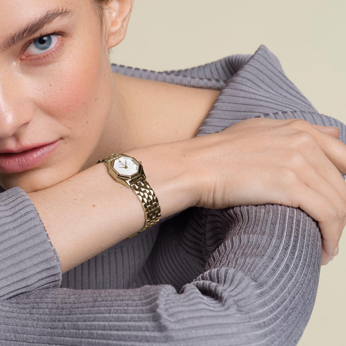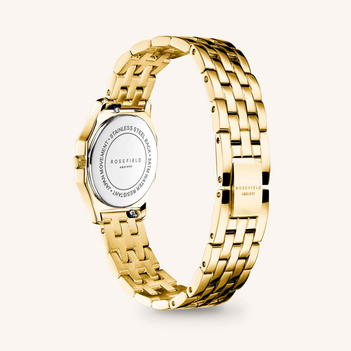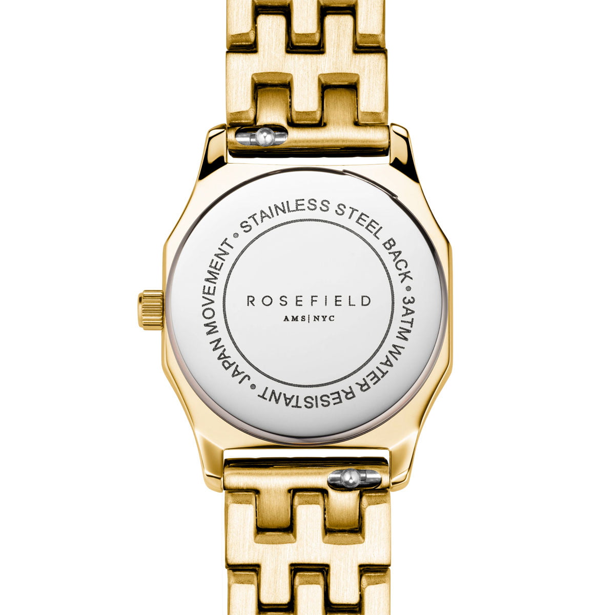 Rosefield Gemme – kollase kulla värvi korpus ja terasest käevõru, heleda numbriga.