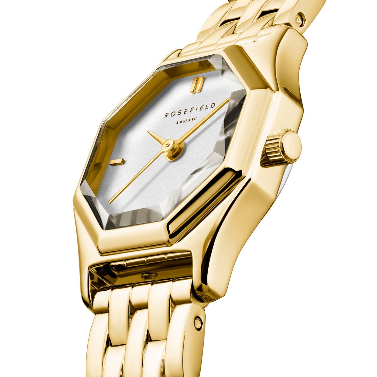 Rosefield Gemme – kollase kulla värvi korpus ja terasest käevõru, heleda numbrilauaga.
