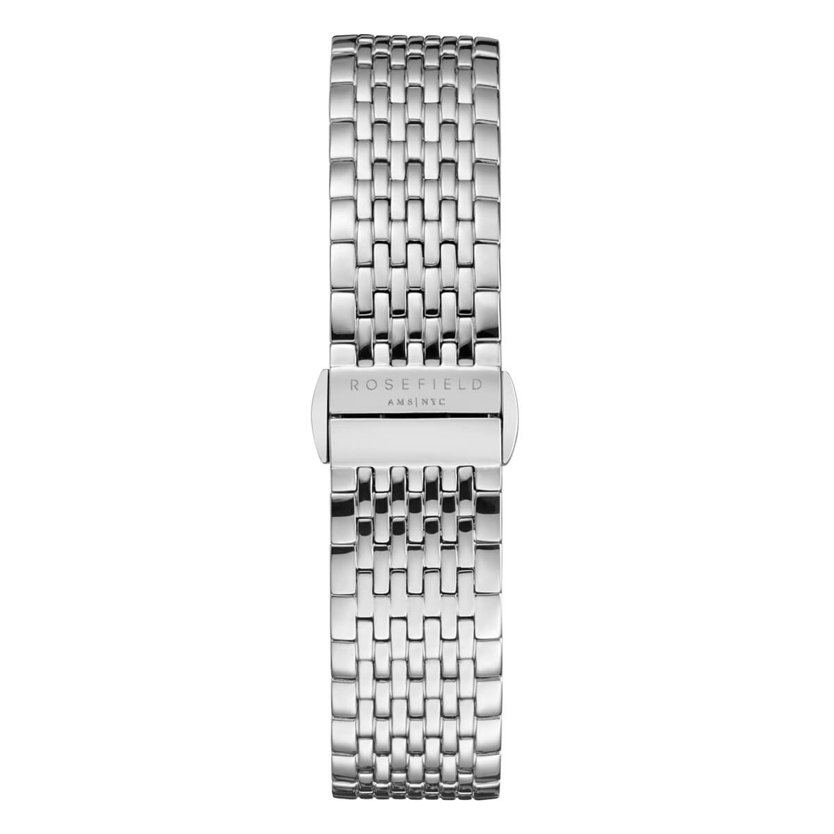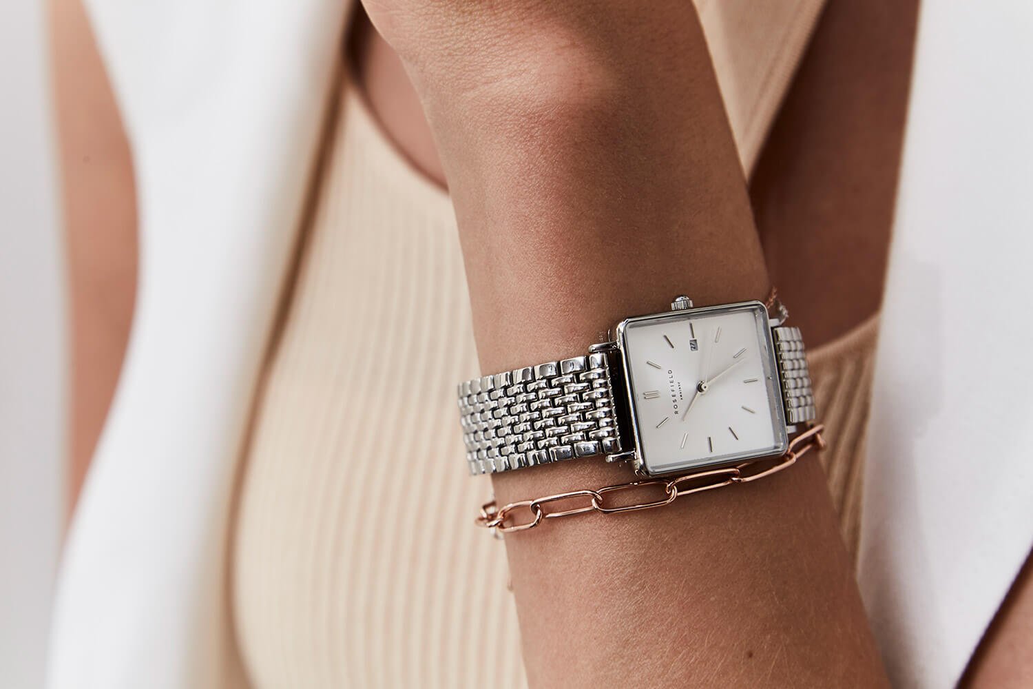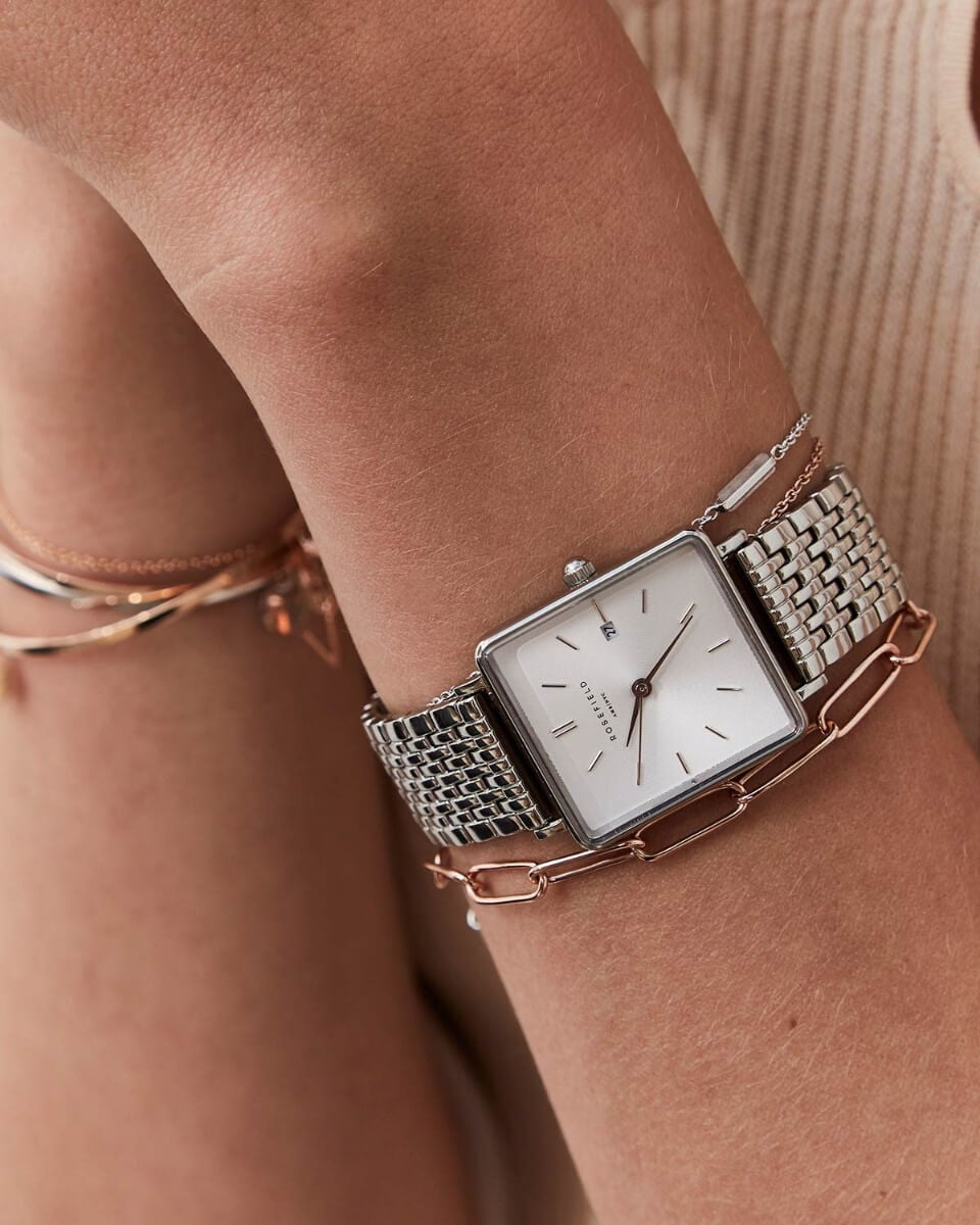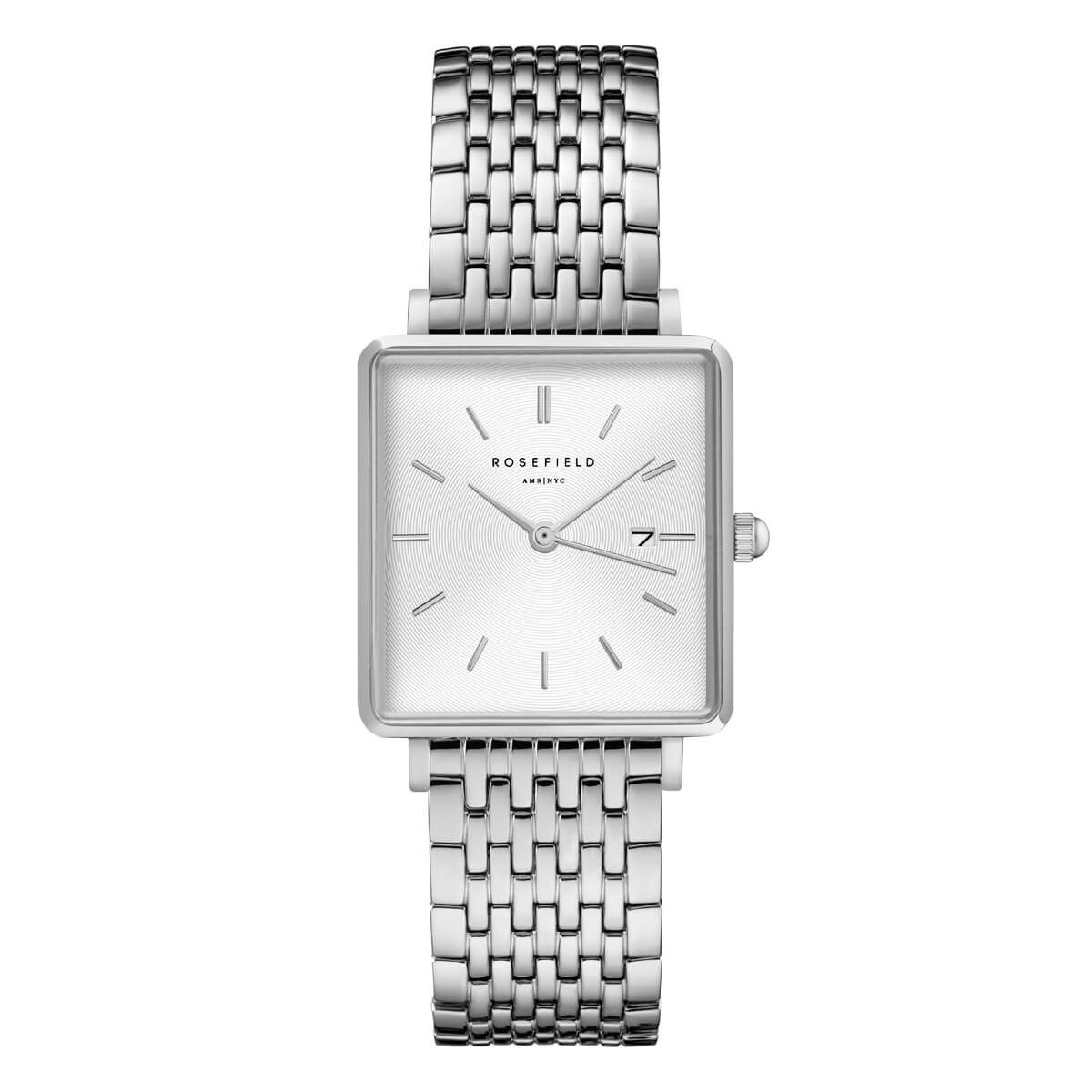 Rosefield The Boxy – hõbedast värvi korpus, tekstuurne heledat värvi päikesekiirgusega numbrileht ja terasest käevõru.