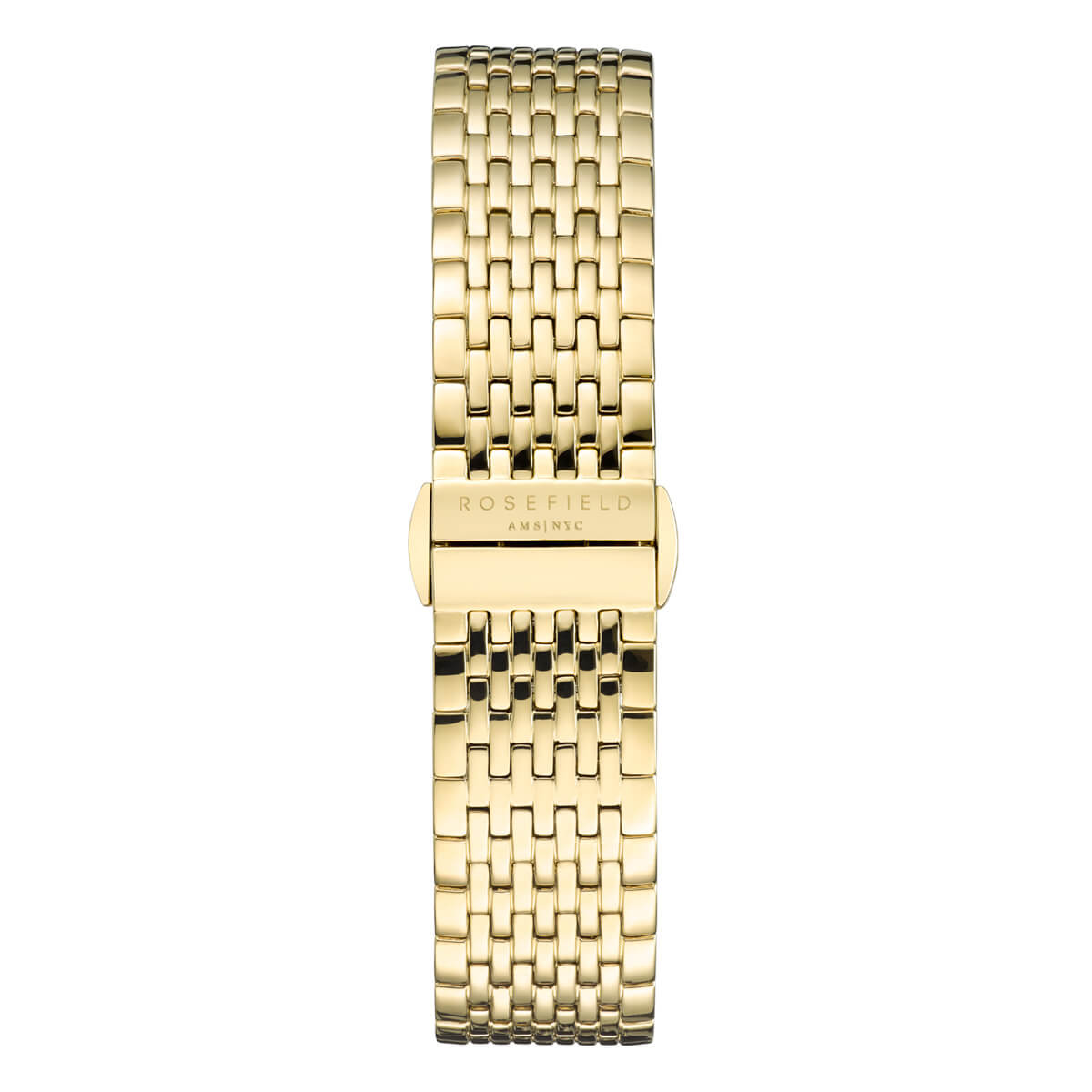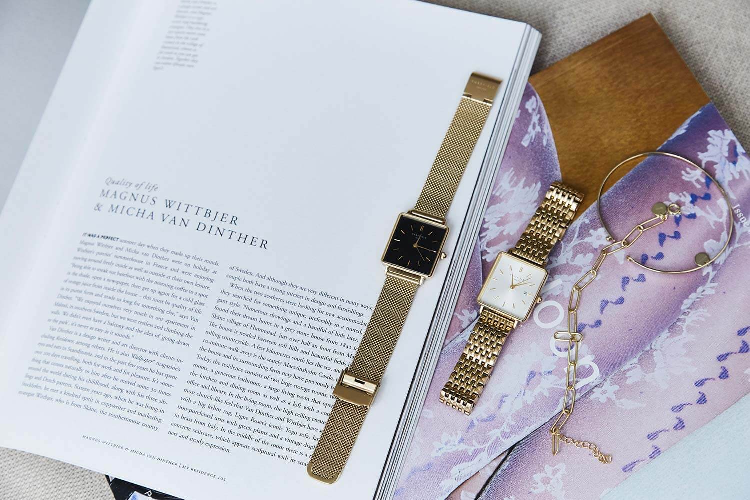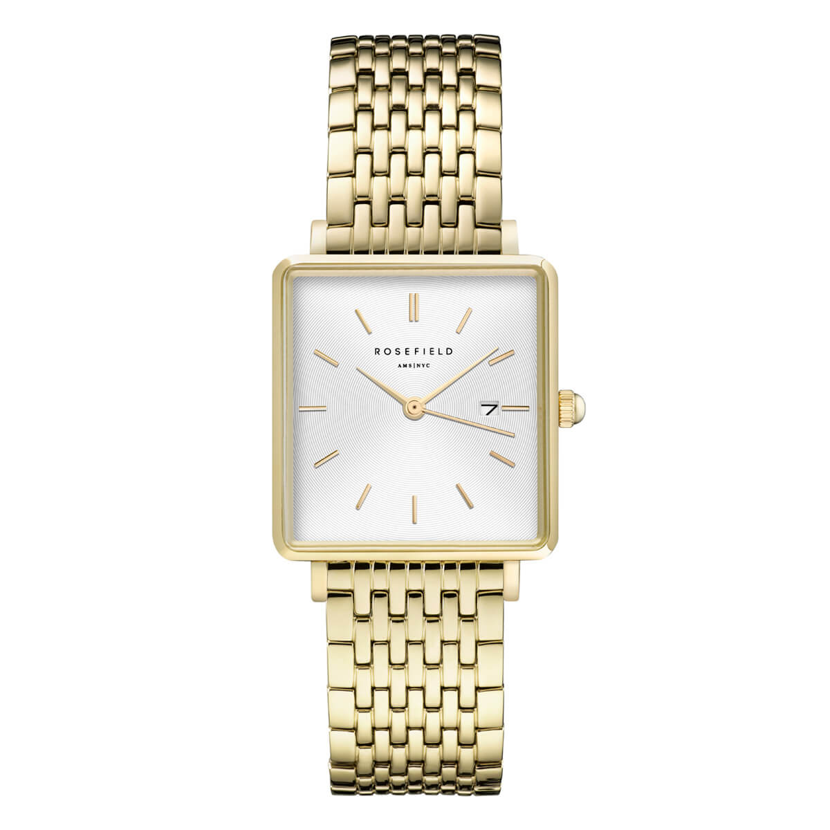 Rosefield The Boxy – kollase kulla värvi korpus ja terasest käevõru, tekstuurne heledat värvi päikeseplekk-kirju numbrileht.