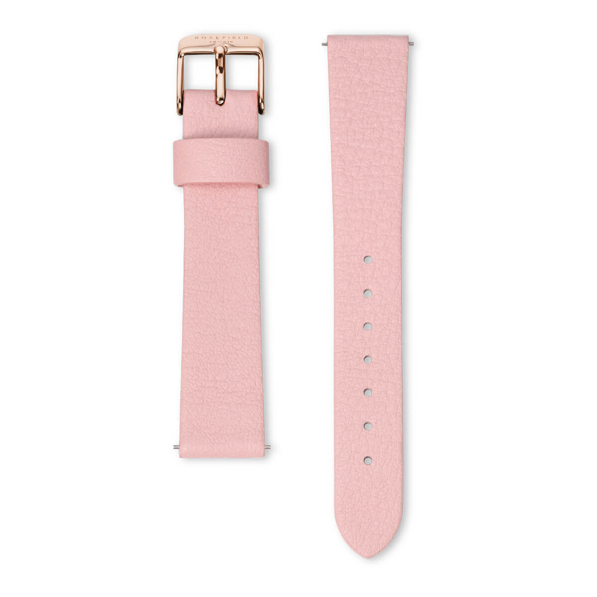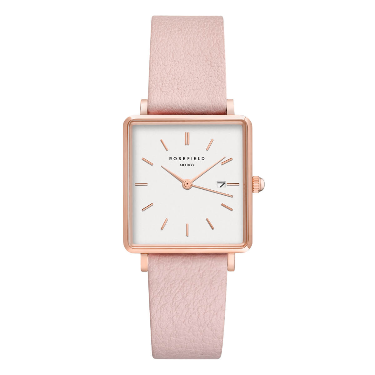 Rosefield The Boxy punase kullatud korpuse, valge numbrimärgi ja roosa nahkrihmaga.