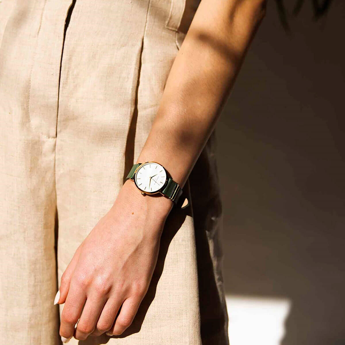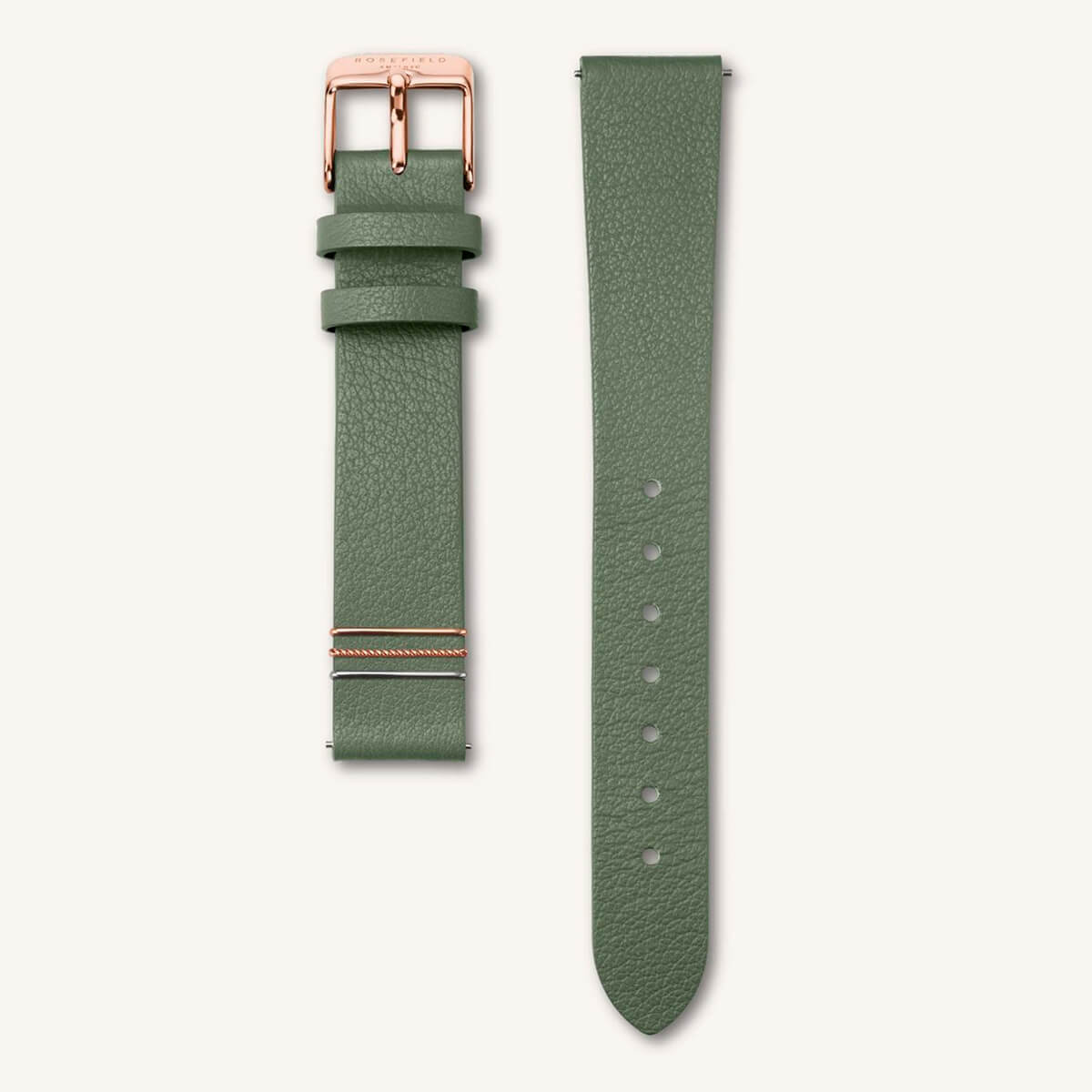 Rosefield West Village kollase kullatud korpuse, valge pärlmutteriga numbrilaua ja oliivrohelise naharihmaga.