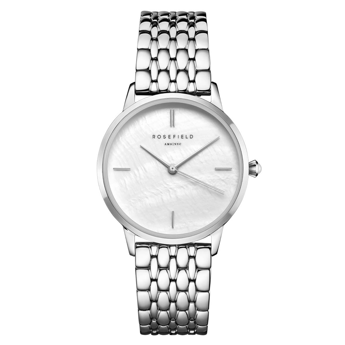 Rosefieldi elegantne Pearl Edit hõbedast värvi käekell valge pärlmutteriga numbrilauaga ja elegantse terasrihmaga. Kellal on kaunis helmedega kaunistus nupul.