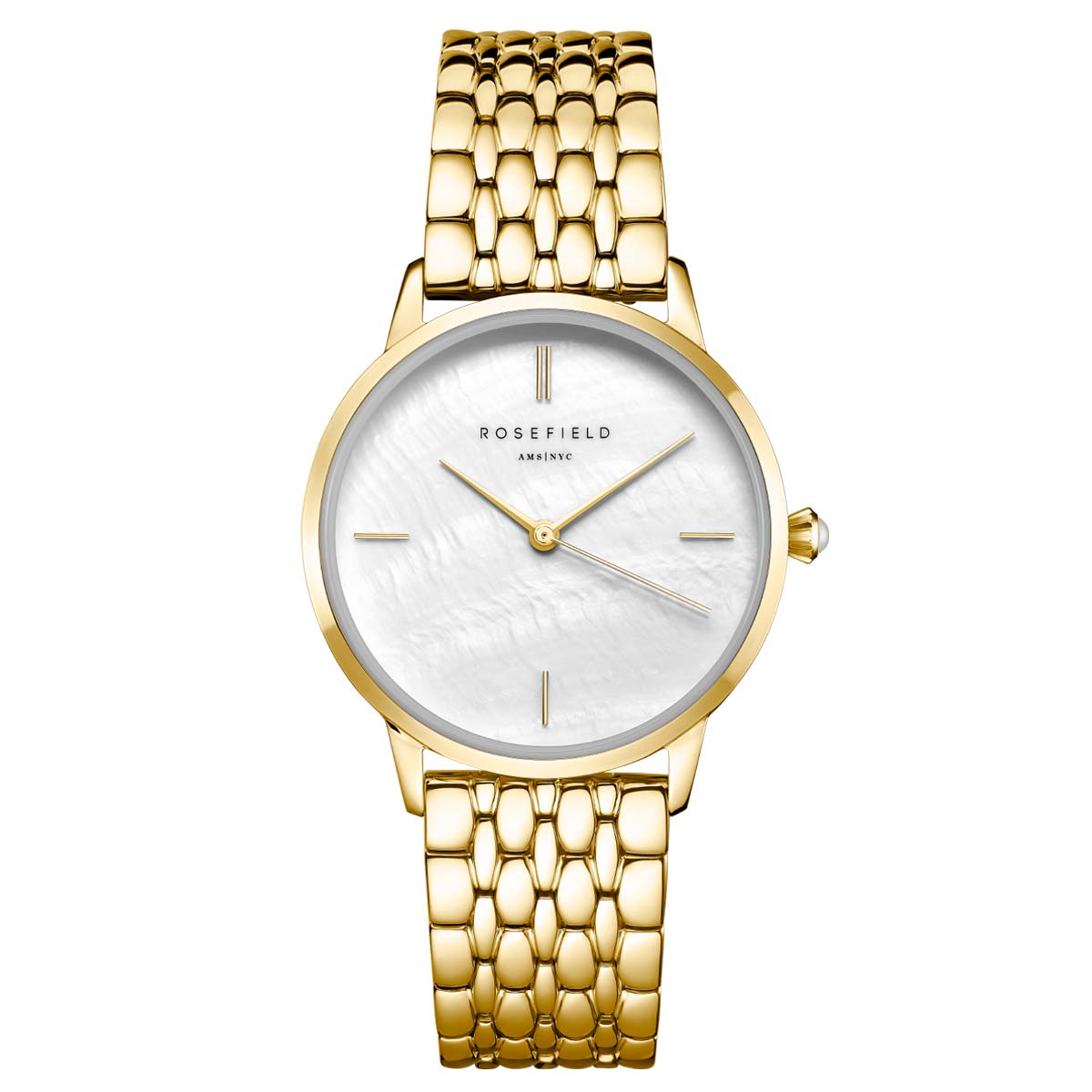 Rosefield elegantne Pearl Edit kullavärviline käekell valge pärlmutterplaadiga ja elegantse kullatud terasest käepaelaga. Kellal on ilus pärlmutterdekoratsioon nupul.