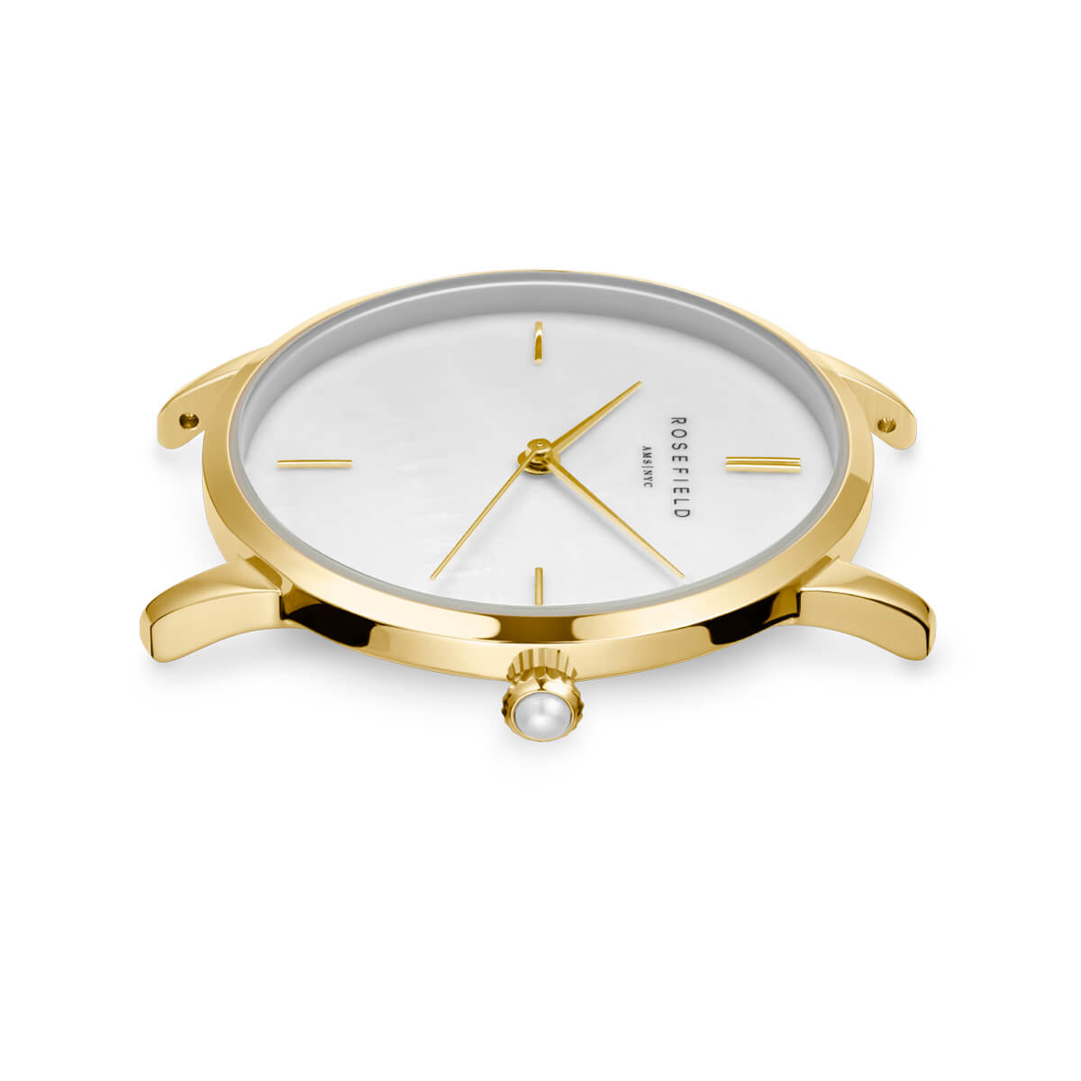 Rosefieldi elegantne Pearl Edit kuldset värvi käekell valge pärlmutteriga numbrilaua ja elegantse kuldse võrkkihtidega käevõrguga. Kellal on ilus helmekujuline kaunistus lüüsilehel.