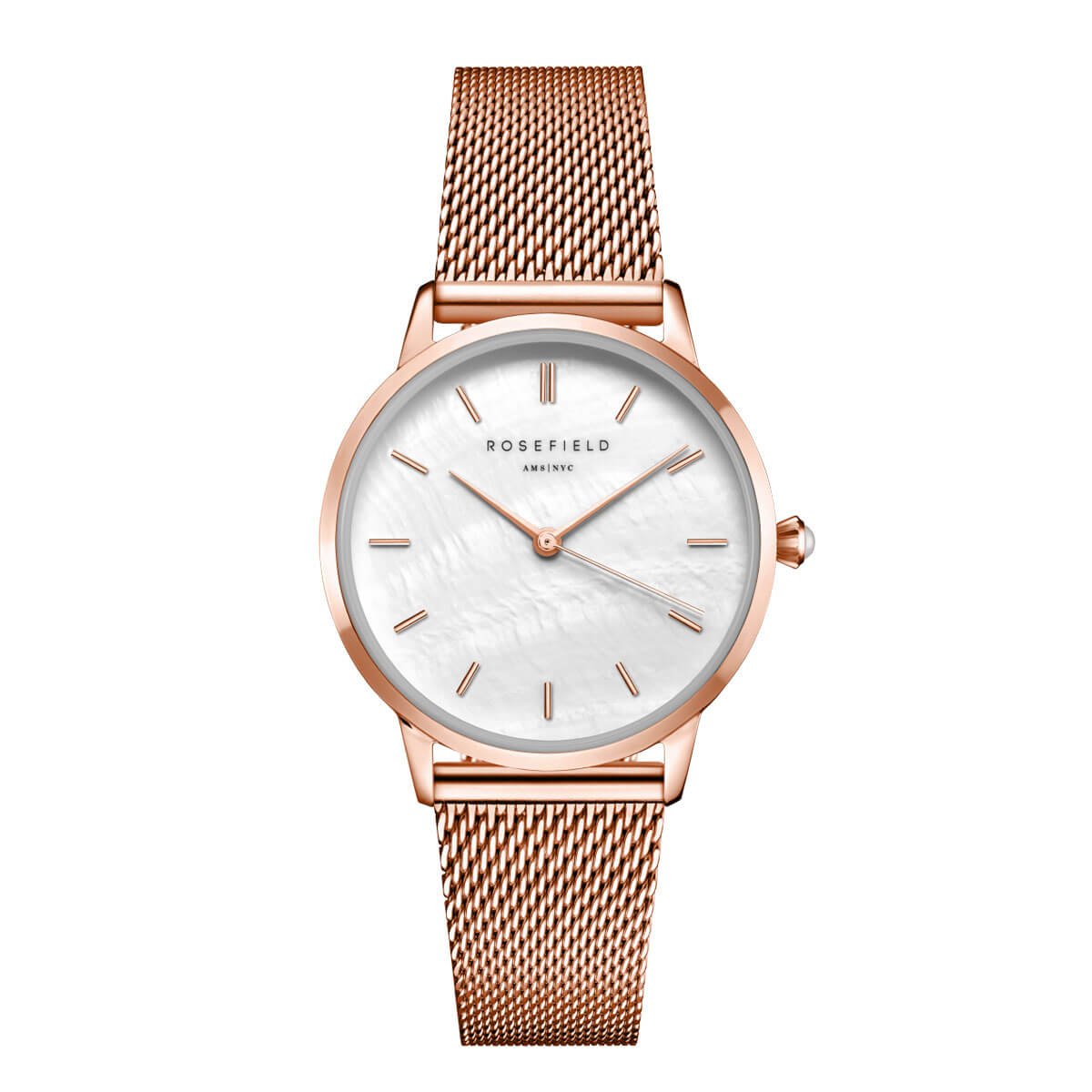 Rosefield elegantne Pearl Edit punast värvi käekell valge pärlmutteriga numbrilauaga ja elegantse punase kuldse võrkkiudse käevõrguga. Kellal on ilus helmekujuline kaunistus lüüsilehel.