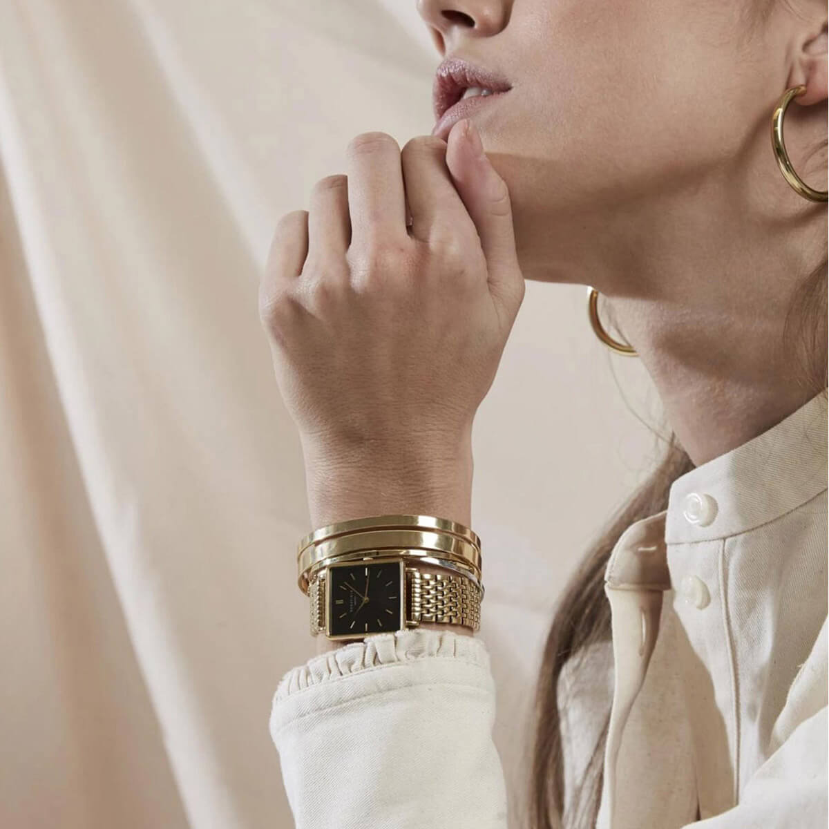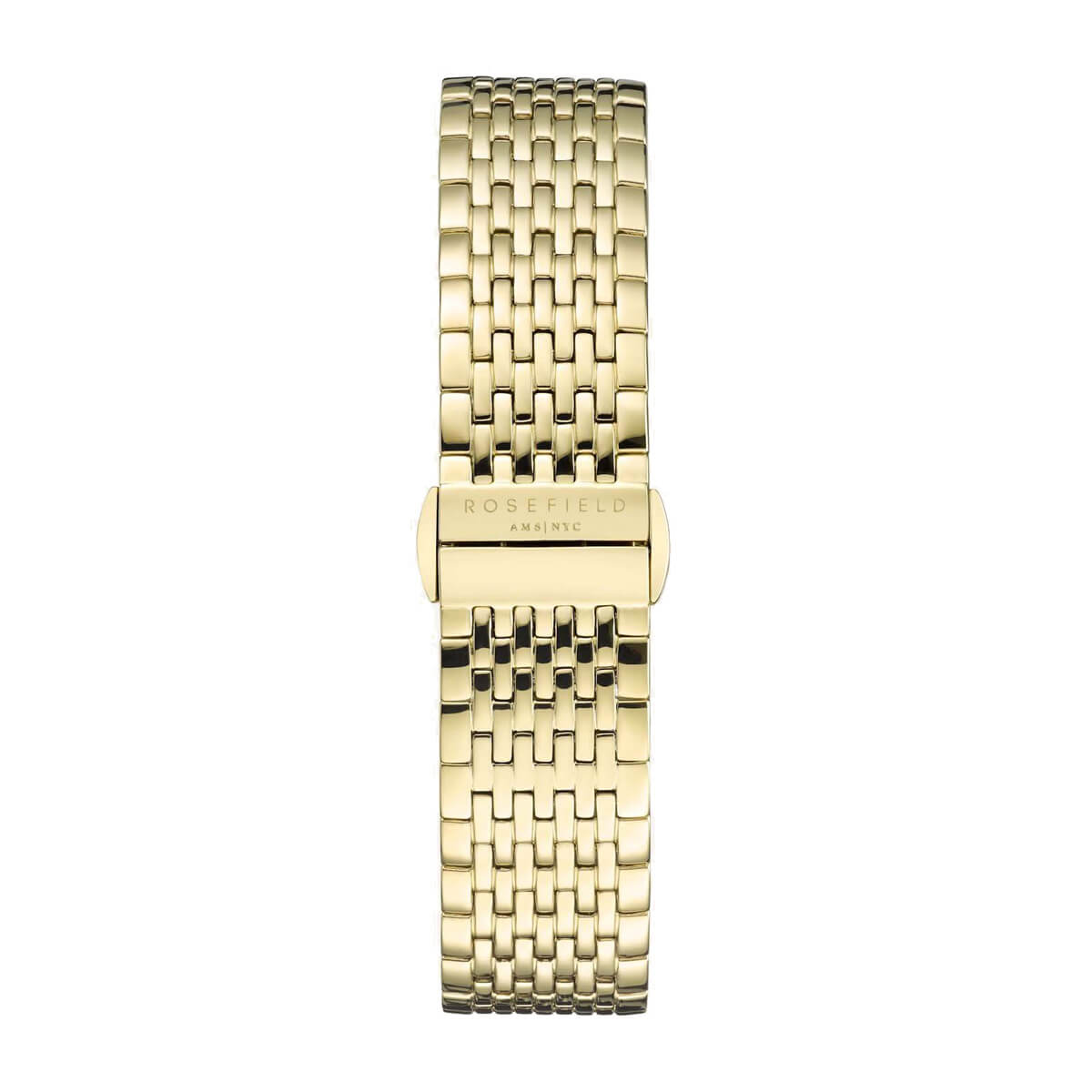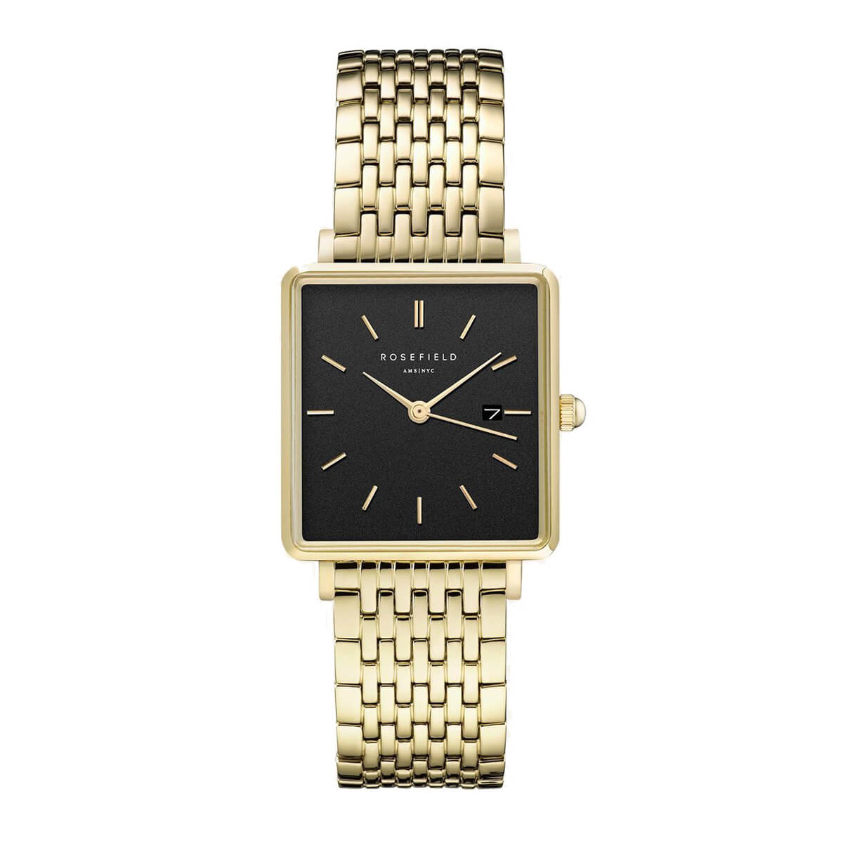 Rosefield The Boxy – kollase kulla värvi korpus ja terasest käevõru, tekstuurne heledat värvi päikeseplekk-kirju numbrileht.