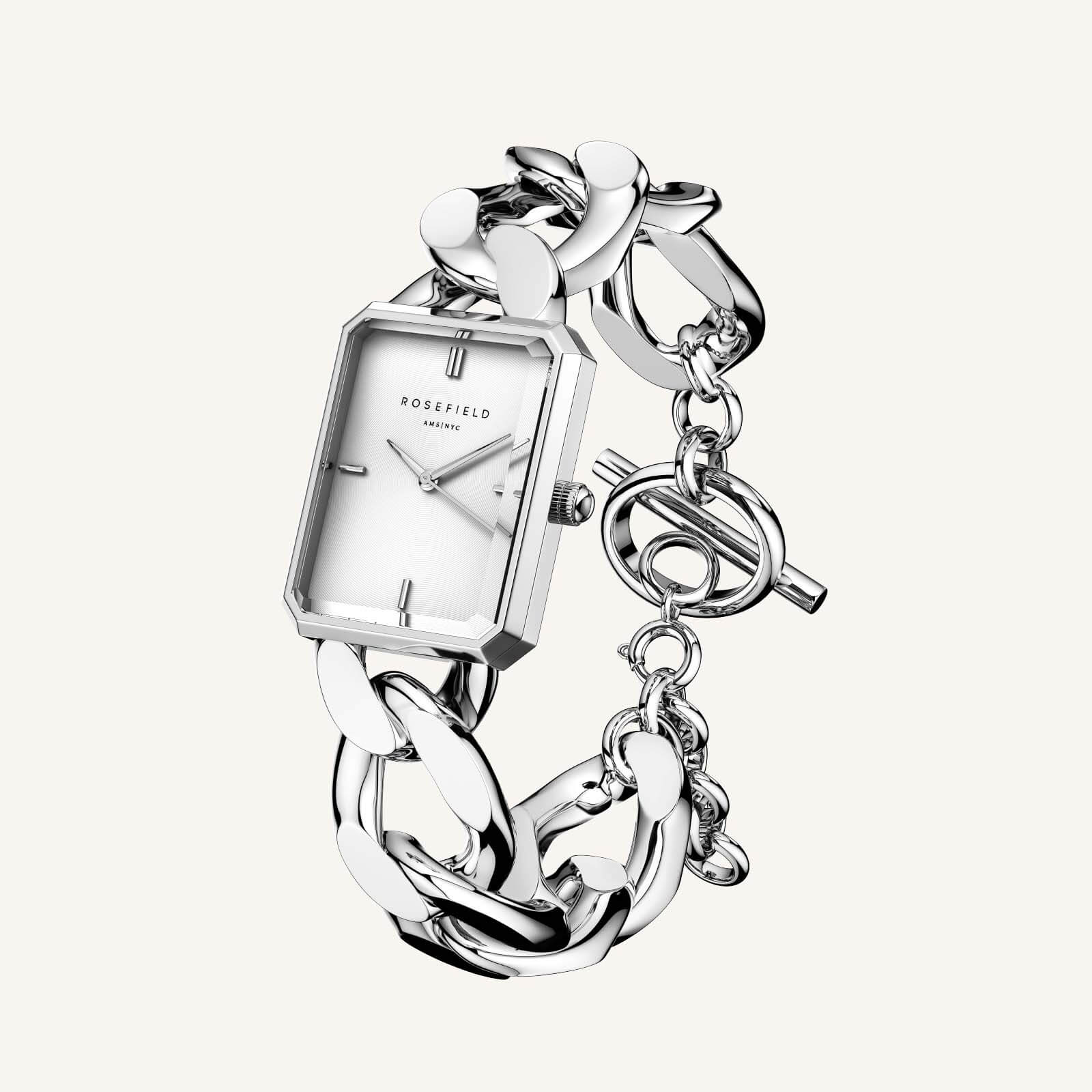 Rosefield The Octagon XS Studio hõbedase käevõruga naiste käekell valge numbrimärgiga.