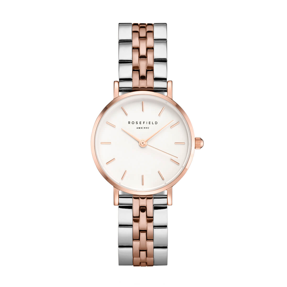 Rosefield – The Small Edit – roosakas kullatud korpus ja kahetooniline roosakas/hõbedast terasest käevõru, valge numbrileht.