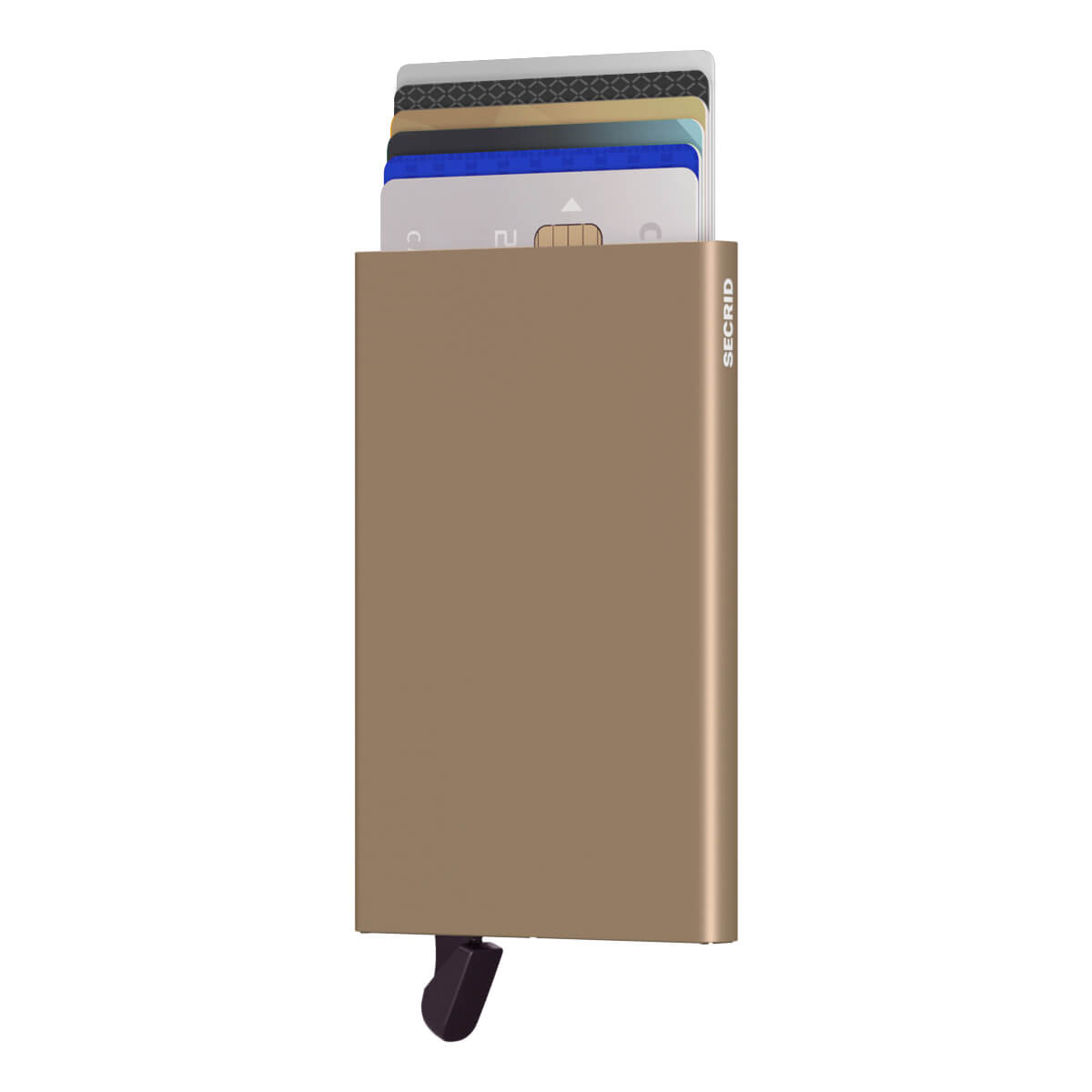 Secrid liivapruun Cardprotector Sand kaardihoidja on kerge ja praktiline. See on valmistatud alumiiniumist ja mahutab kuni 6 kaarti, mida saab nupuvajutusega järk-järgult tõsta. See teeb soovitud kaardi valimise lihtsaks.