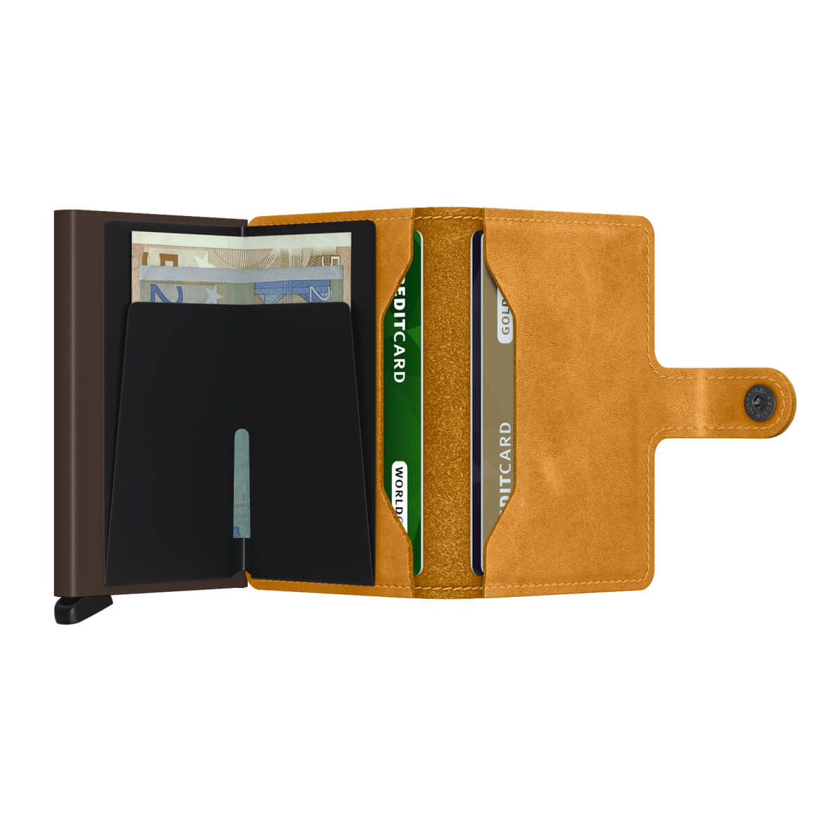 Secridi ookerkollane Miniwallet Vintage Ochre rahakott on suurepärane valik sulle, kes vajad väikest, taskusse mahtuvat ja turvalist rahakotti. Rahakotti mahub 4-8 kaarti, pangatähti ja kviitungeid nahast sektsiooni ja umbes 6 kaarti alumiiniumist Cardprotector sektsiooni. Kaardid tõstetakse mugavalt ja astmeliselt üles, tõmmates alumist hooba, mis võimaldab teil hõlpsasti valida vajaliku kaardi. Rahakott sulgub klõpskinnitusega, nii et seda saab kanda käekotis või rahakotis.