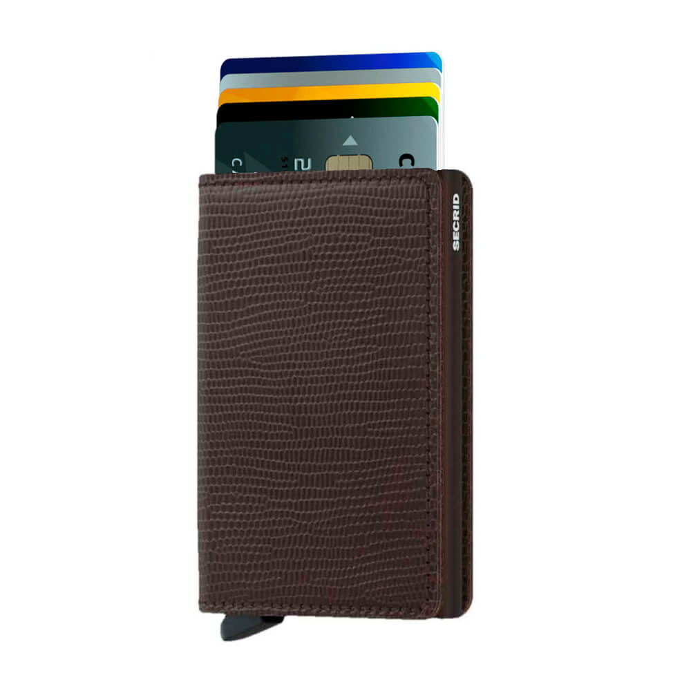 Secrid Brown Slimwallet Rango Brown Brown rahakott on suurepärane valik sulle, kes vajad väikest, taskusse mahtuvat ja turvalist rahakotti. Rango nahk on värvitud ja sisaliku mustriga ning mustust hülgavaks satiiniga poleeritud. Rahakotti mahub 4-8 kaarti, pangatähti ja kviitungeid nahast sektsiooni ja umbes 6 kaarti alumiiniumist Cardprotector sektsiooni. Kaardid tõstetakse mugavalt ja astmeliselt üles, tõmmates allosas asuvat hooba, mis võimaldab teil hõlpsasti valida vajaliku kaardi.