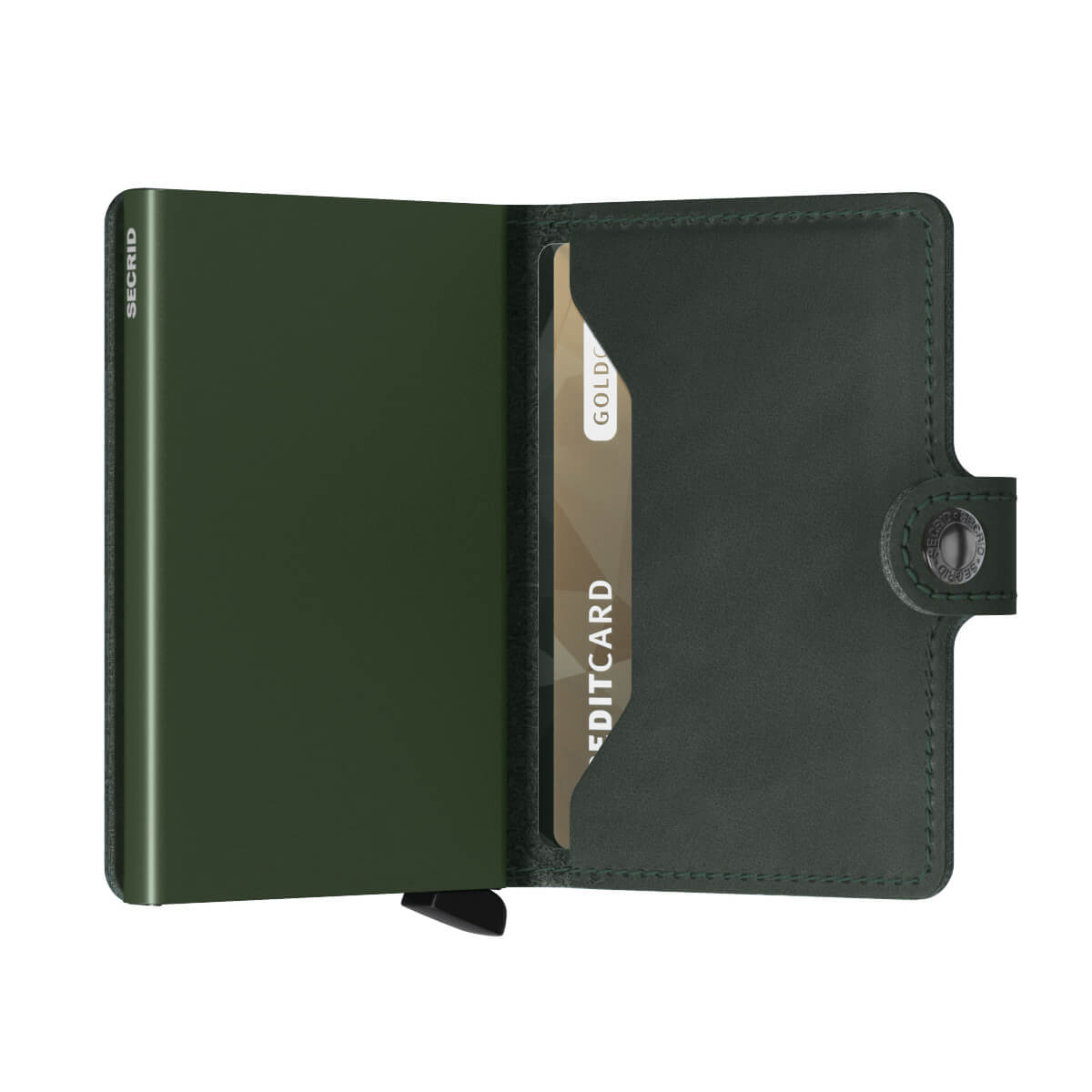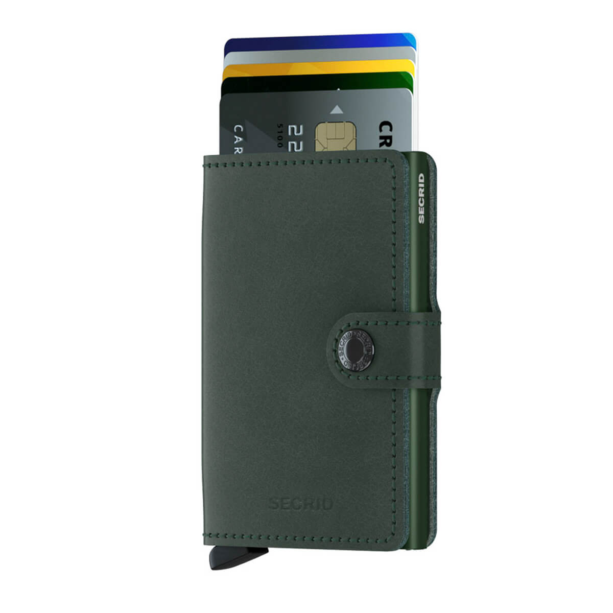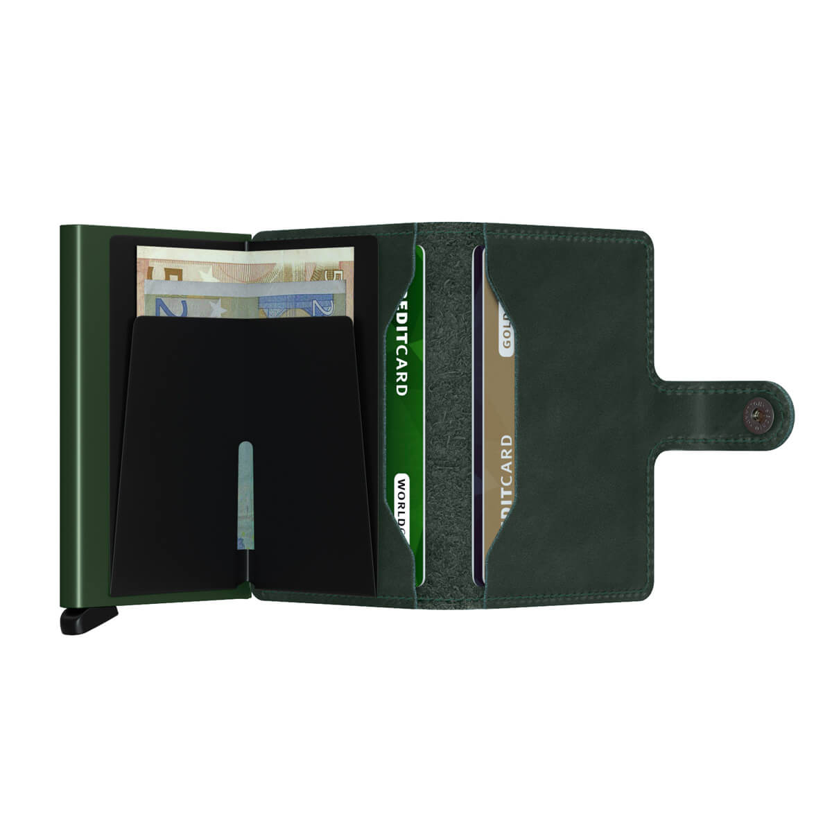 Secridi roheline Miniwallet Original rahakott on suurepärane valik sulle, kes vajad väikest, taskusse mahtuvat ja turvalist rahakotti. Rahakotti mahub 4-8 kaarti, pangatähti ja kviitungeid nahast sektsiooni ja umbes 6 kaarti alumiiniumist Cardprotector sektsiooni. Kaardid tõstetakse mugavalt ja astmeliselt üles, tõmmates alumist hooba, mis võimaldab teil hõlpsasti valida vajaliku kaardi. Rahakott sulgub klõpskinnitusega, nii et seda saab kanda käekotis või rahakotis.