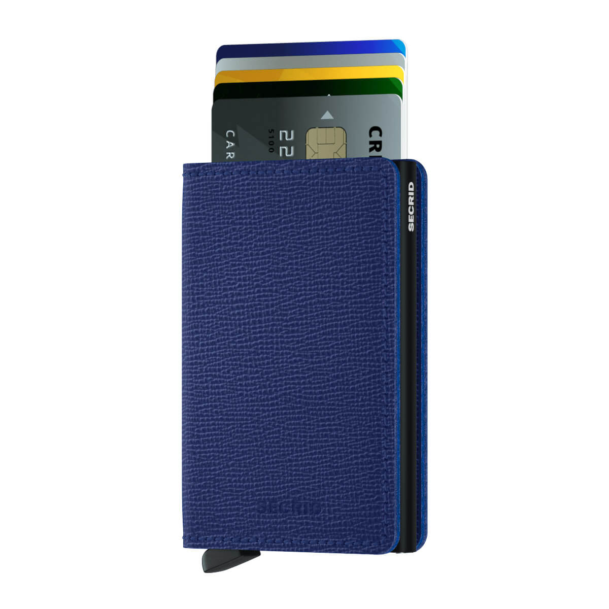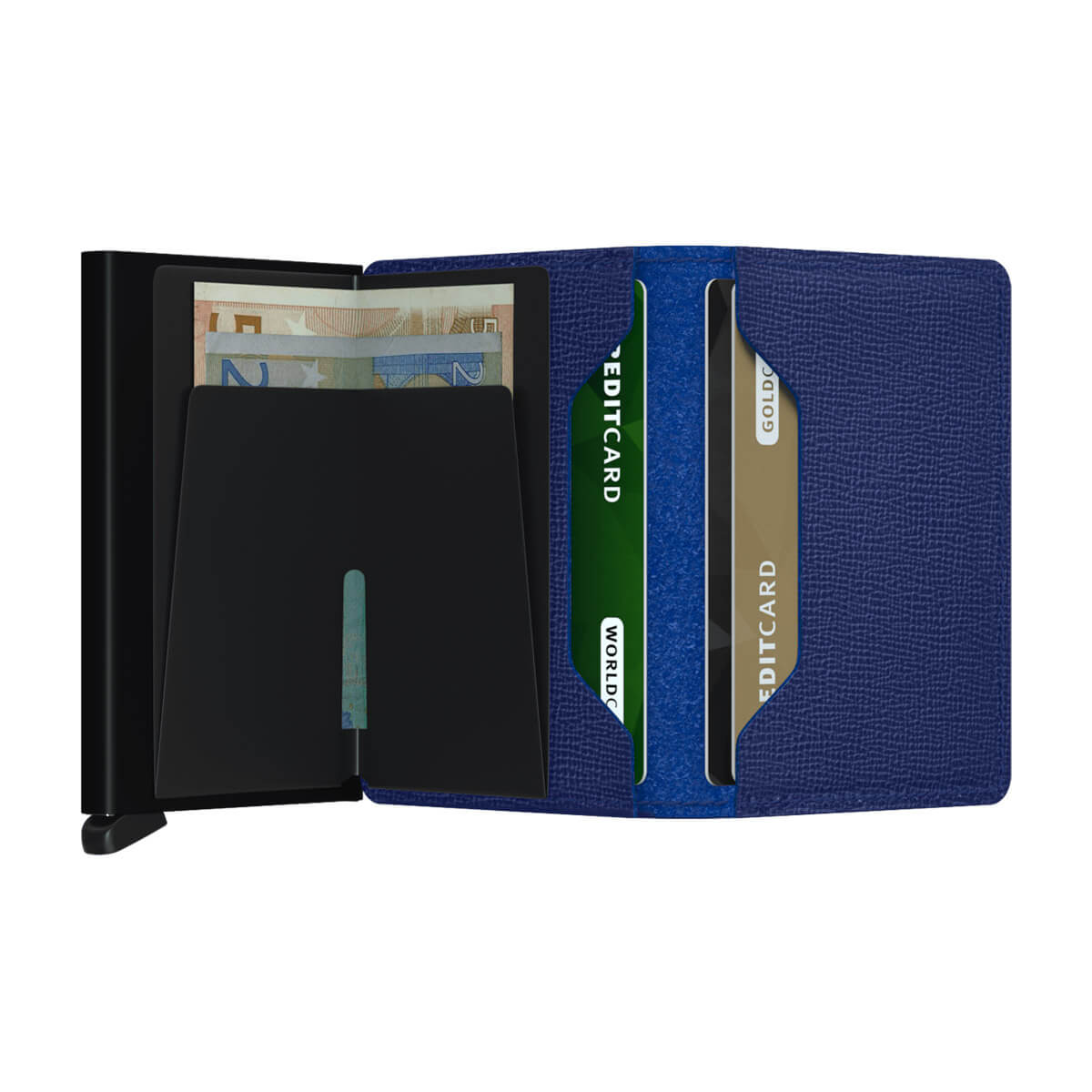 Secrid sinine Slimwallet Crisple Blue rahakott on suurepärane valik sulle, kes vajad väikest, taskusse mahtuvat ja turvalist rahakotti. Rahakotti mahub 4-8 kaarti, pangatähti ja kviitungeid nahast sektsiooni ja umbes 6 kaarti alumiiniumist Cardprotector sektsiooni. Kaardid tõstetakse mugavalt ja astmeliselt üles, tõmmates alumist hooba, mis võimaldab teil hõlpsasti valida vajaliku kaardi.